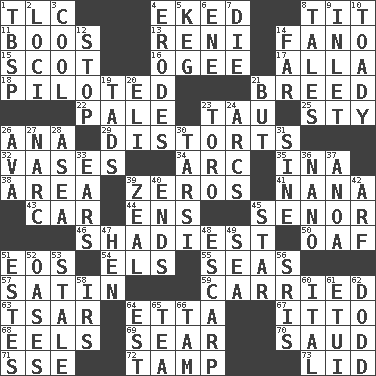 ACROSS 1. Affectionate concern, for short 4. Made supply last 8. Teat (slang) 11. Scornful sounds 13. Painter Guido (1575-1642) 14. Papal veil 15. Native of Scotland 16. Double curve, resembling the letter S 17. Silent film actress Nazimova 18. Manned the helm 21. A special lineage 22. Diluted with white 23. The 19th letter of the Greek alphabet 25. Filthy place 26. Santa ___, CA 29. What propaganda does 32. Flower holders 34. Curve 35. _ tizzy (2 wds.) 38. Type of rug 39. Nothings 41. Grandmother 43. Auto 44. Followers of ems 45. Sir (Sp.) 46. Most questionable 50. Clumsy lout 51. Greek goddess of the dawn 54. Raised railways 55. Oceans 57. Smooth fabric 59. Borne 63. Russian ruler of old 64. Singer James 67. "Tell ____ the Marines!" 68. Snakelike fish 69. Singe 70. Saudi Arabian king (1953-1964) 71. Compass dir. 72. Pack (down) 73. Flaplike covering DOWN 1. Cook's measure (abbr.) 2. Event scenes 3. Calm and collected 4. Eats (away) 5. Cask 6. Compass dir. 7. Pass on 8. Lies 9. An arm off of a larger body of water 10. Sycophant 12. Constrict 14. Distant 19. Small boys 20. Connecticut Ivy Leaguer 21. With the exception that 23. "Corrida" creature 24. Curves 26. Actress Gardner 27. Drug cop 28. Toward the sea 30. Tarsus (plural) 31. Trig term 33. Hearing organs 36. Billionth: prefix 37. Small Philippine buffalo 39. Ardor 40. Extremities 42. Sandy's bark 45. Play the lead 47. Layer 48. Fortification 49. Ocean 51. _____ Park, CO 52. Fertile tracts in a desert 53. Showing deterioration from age 56. Indian titles of respect 58. Big collection agency 60. Slanted text style (abbr.) 61. Needle case 62. Texas town _ City 64. Eastern Standard Time (abbr.) 65. Beverage made from leaves 66. Scottish cap