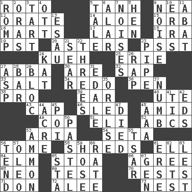 ACROSS 1. Printing process, for short 5. Hyperbolic tangent 9. Teachers' org. 12. Declaim 14. _ vera 15. Globe 16. Shops 17. (Had) reclined 18. Lyricist Gershwin 19. Pacific Standard Time (abbr.) 20. Michaelmas daisies 23. Inconspicuous attention getter 24. Malaysian steamed pastry 25. 4th largest of the Great Lakes 27. Swedish rock group 30. "We ___ not amused" (Victoria) 32. Plant excrement 33. Table seasoning 34. Do over again 36. Fenced enclosure 38. Adept person 39. Hearing organ 40. Shoshoni 43. Head covering 46. Downhill vehicle 48. Among 49. Police officer (slang) 51. Biblical high priest 52. Lettered men learn these first 53. Operatic vocal solo 54. Stalk of a moss capsule 56. Heavy book 58. Fragments 61. Pipe bend 64. Shade tree 65. Portico 66. Match 68. Modern: prefix 69. Trial 70. Musical pauses 71. Spanish title 72. Toward shelter 73. Egg locale DOWN 1. Frolic 2. Mouths or openings 3. Small pie 4. Baseball player Mel 5. Story 6. Having or resembling wings 7. Annoying sounds 8. Layer 9. Annoying sound 10. Blunders 11. Blind as ____ 13. Son of Isaac 21. Burn superficially 22. Triads 23. Corncob 24. Krazy ___ of comics 26. Hit sharply and swiftly 27. Cleo's killer 28. Tavern 29. Alliance 31. Peak District village in England 35. Threatening words 37. Unfeeling 41. Nervous spasm 42. Begley and Asner 44. 43,560 square feet 45. Luau course 47. Passed on 48. Auto club (abbr.) 50. Soft color 53. ID or VA city 55. Russian ruler of old 56. Look after 57. Butter sub 59. Stockings 60. Pace 61. Celtic language 62. Allows 63. For fear that 65. R.R. building 67. Commissioned mil. rank
