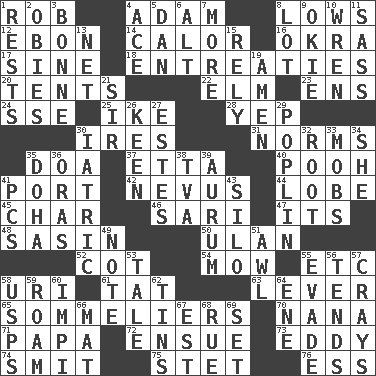 ACROSS 1. Director Reiner 4. First of billions? 8. Coldest temperatures 12. Inky black, to poets 14. Bodily heat indicating an inflammation 16. Gumbo ingredient 17. Trig term 18. Pleas 20. Portable shelters 22. Shade tree 23. Followers of ems 24. Compass dir. 25. Mamie's husband 28. Slangy assent 30. Angers 31. Typical models 35. ___ good deed 37. Singer James 40. "Silly old bear" 41. Left side of a ship or aircraft 42. Mole, birthmark 44. Ear part 45. Burn to charcoal 46. Indian skirt 47. ___ a Wonderful Life 48. Indian antelope 50. ____ Bator, Mongolia 52. Small bed 54. Cut the grass 55. And so on (abbr.) 58. RI univ. 61. Make lace 63. Crowbar 65. Wine waiters 70. Grandmother 71. Dad 72. Follow as a consequence or result 73. Whirlpool 74. Stricken, poetically 75. Proofreading order 76. Curvy letter DOWN 1. Musical pauses 2. Off-Broadway awards 3. Maid-servant 4. Adept person 5. Daniel's nick name 6. Keyboard modifier key 7. Greater amount 8. Car dealer's back yard 9. Migrant worker of the '30s 10. Songbird 11. Backtalk 13. Fish or hair follower 15. Have confidence or faith in 19. So be it 21. Title for a knight 26. Peachy ____! 27. _____ Park, CO 29. Cotton for raincoats, e.g. 30. Of or pertaining to medicine 32. Carrot, for example 33. Disorderly crowds 34. A female animal or person 35. Capital of the state of Qatar 36. Mouths or openings 38. Federal power corp. 39. Gold (Symbol: Au) 41. Personal Computers (abbr.) 43. Grain storage tower 49. Musical sound 51. Leather borer 53. Falsehood 55. Elude 56. Is inclined (to) 57. Trading vessels 58. United States Postal Service (abbr.) 59. Wander 60. Body of Kaffir warriors 62. Metal containers 64. Compass dir. 66. Floor protector 67. Eastern Standard Time (abbr.) 68. Sorrow 69. Put into a specified state