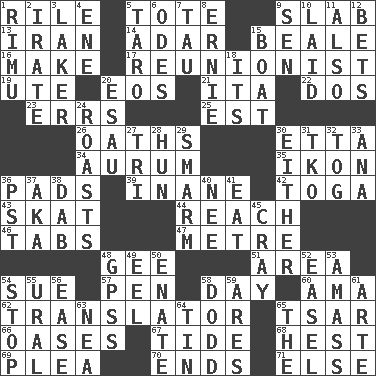 ACROSS 1. Cause heat under the collar 5. Carryall 9. Thick slice 13. SW Asia republic 14. The sixth month of the Jewish calendar 15. Calif. Air Force Base 16. Create 17. One who advocates reunion 19. Shoshoni 20. Greek goddess of the dawn 21. Call ___ day 22. Two (Sp.) 23. Blunders 25. Eastern Standard Time (abbr.) 26. Profane or obscene expressions 30. Singer James 34. Gold (Symbol: Au) 35. Visual representation of an object 36. Groovy apts. 39. Silly 42. Ancient Roman robe 43. Three-handed card game 44. Arrive at 46. Bar bills 47. Distance measurement (Brit.) 48. Turn to the right 51. Length times width 54. Institute legal proceedings 57. Animal enclosure 58. 24 hours 60. Wet nurse (var.) 62. Interpreter 65. Russian ruler of old 66. Fertile tracts in a desert 67. Periodic rise and fall of the sea level 68. Behest 69. Entreaty 70. Extremities 71. Otherwise DOWN 1. Tall New Zealand timber tree 2. Feeling or showing extreme anger 3. Member of a famous L.A. basketball team 4. Compass dir. 5. Edible starchy tuberous root 6. Lyric poems 7. The 19th letter of the Greek alphabet 8. Bert's buddy 9. Elected rep. 10. Put down 11. In addition 12. Antes 15. Water vessel 18. ___ a Wonderful Life 20. He sold his birthright 24. Ridicules or criticizes harshly 27. Three (prefix) 28. Attila the _ 29. Excessive but superficial compliments 30. One or the other of two 31. Ring climax 32. Coat; cloak 33. Santa ___, CA 36. Pacific Standard Time (abbr.) 37. Alias (abbr.) 38. Pat or tap gently 40. Born 41. Consume 45. Supercomputer manufacturer 48. Global Positioning Systems (abbr.) 49. Snakelike fish 50. Related on the mother's side 52. Artist's stand 53. Collect or gather 54. Obstruct or block passage 55. Mountain range 56. Comfort 58. Texas town _ City 59. Ancient Greek god of war 61. Johnson of "Laugh-In" 63. Teachers' org. 64. Shallow baking pan 65. Definite Article