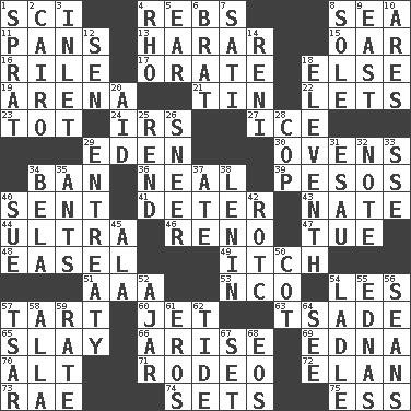 ACROSS 1. _-fi 4. Confederate soldiers (slang) 8. Ocean 11. Baking dishes 13. Ethiopian city, capital of Harari 15. Rowing implement 16. Cause heat under the collar 17. Declaim 18. Otherwise 19. Sports stadium 21. Shallow baking pan 22. Allows 23. Small child 24. Big collection agency 27. Frozen water 29. Locale of original sin 30. Baking chambers 34. Forbid 36. Be tempered by heat 39. Mexican monetary units 40. Emitted 41. Prevent from occurring 43. Nathan's nickname 44. Extreme 46. Western Nevada city 47. Third day of the wk. 48. Artist's stand 49. Hankering 51. Auto club (abbr.) 53. Non-commissioned officer (abbr.) 54. French article 57. Small pie 60. Passenger plane 63. Sadhe (variant) 65. Kill 66. Ascend 69. Pulitzer Prize-winning author Ferber 70. Keyboard modifier key 71. Cowboy competition 72. Enthusiasm 73. Actress Charlotte 74. Arranges properly for use 75. Double-curved letter DOWN 1. Small fatty European fish 2. Capital of Egypt 3. An arm off of a larger body of water 4. 17th letter of the Greek alphabet 5. Hearing organ 6. Naughty child 7. Suttee (variant) 8. Not divided or shared with others 9. 90 degrees 10. Ancient Greek god of war 12. Elected rep. 14. Painter Guido (1575-1642) 18. Veterans Day date 20. Help 25. Tear apart 26. Contemptuous expression 28. Police officer (slang) 29. Plea 31. He sold his birthright 32. Short letter 33. Compass dir. 34. Actor Lugosi 35. Pismires 37. Had dinner 38. Soviet premier 1918-24 40. Institute legal proceedings 42. College mil. group 45. Wing 50. Small bed 52. Partly open 54. Dipping utensil 55. Ferber et al. 56. Actors Connery and Penn 57. Russian ruler of old 58. Silent film actress Nazimova 59. Assign a rank or rating to 61. Greek god of love 62. Event that recurs at intervals 64. Perceive with the eye 67. Arrange properly for use 68. Greek goddess of the dawn