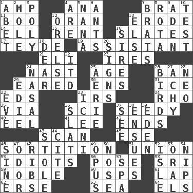 ACROSS 1. Electrical Unit 4. Santa ___, CA 7. Naughty child 11. Surprise greeting 12. Northwest Algerian city 13. Wear away 14. Pipe bend 15. Monthly bill 16. Chalkboards 17. Miss Universe 1986, Barbara Palacios _ 19. Helper 21. Biblical high priest 23. Angers 24. Political cartoonist Thomas 25. Mature 26. Forbid 29. Having ears or earlike features 30. Followers of ems 31. Frozen water 32. Begley and Asner 33. Big collection agency 34. 17th letter of the Greek alphabet 35. By way of 36. _-fi 37. Shabby and untidy 40. Snakelike fish 41. Area sheltered from the wind 42. Extremities 43. Examine minutely or intensely 45. Compass dir. 46. Determination 51. The state of being joined or united 55. Foolish or stupid persons 56. Introduce or present, as a question 58. Indian title of respect (Mr.) 59. Having high moral qualities 60. United States Postal Service (abbr.) 61. Infant locale 62. Celtic language 63. Ocean 64. Raised railways DOWN 1. Collude with 2. Undercover agent 3. Many (prefix) 4. "We ___ not amused" (Victoria) 5. Nanny 6. Pismires 7. Naughty children 8. Round or rotation of duties 9. An important port of Yemen 10. Trial 12. Threatening words 13. Otherwise 16. Begets 18. Letter starter 20. Signals 22. It would 24. Rhinal 25. Nest on high 26. Avian creatures 27. Painful 28. Modern: prefix 29. Singer Brickell 32. Night before a holiday 33. Ancient Celtic tribe of eastern Britain 36. Narrow boards 37. Observe 38. Takes place subsequently 39. Paradise 43. Took without asking 44. Quote 46. Trig term 47. Aroma 48. Chest bones 49. Musical composition 50. Olfactory organ 52. Capri or Wight 53. Spoken 54. Pinches, bites 57. Health resort