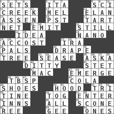 ACROSS 1. Puts into a specified state 5. Call ___ day 8. _-fi 11. Small stream 13. Cartoonist voice _ Blanc 14. Enthusiasm 15. NE Netherlands city 16. Pacific Standard Time (abbr.) 17. Small pie 18. Remaining after all deductions 19. Send forth 21. Free from disturbance or agitation 22. The main thing one is thinking about 24. Billionth: prefix 25. Buttonhole 27. Lyricist Gershwin 29. Friends 30. Window treatment 32. Woody plant 33. Gospel singer Marvin 35. "____ silly question..." 39. Short, simple song 41. Proofreading order 42. Big _ 43. Develop 45. Cook's measure (abbr.) 48. Root beer relative 49. Imelda's hoard 50. Parka part 52. Three (prefix) 55. Prong on a fork 56. Coat; cloak 57. Keyboard key 59. Taverns 60. 100% 61. Biscuitlike quick bread 62. To separate or throw off 63. Turn to the right 64. Singles DOWN 1. Skim 2. Celtic language 3. A testis 4. Perceive with the eye 5. Body of Kaffir warriors 6. Trial 7. Keyboard modifier key 8. Killed 9. Monte _, Las Vegas Hotel/Casino 10. International (abbr.) 12. Leg joints 14. Singer James 20. Floor protector 21. Fastener 23. Administered medicine 25. Fitting 26. Automobile 27. Big collection agency 28. Actress Charlotte 30. 24 hours 31. Artist's stand 33. R.R. building 34. And so on (abbr.) 36. Ski resort town in Vermont 37. Barrel 38. Had dinner 40. Naughty children 43. Environmental prefix 44. Methods 45. One or ones belonging to thee 46. Maid-servant 47. Observes 49. Move through with a circular motion 50. Opening into or through something 51. Stare 53. French philosopher Descartes 54. Angers 56. Label 58. Non-commissioned officer (abbr.)