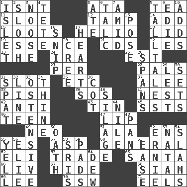 ACROSS 1. Is not 5. "One Day ___ Time" 8. Beverage made from leaves 11. A type of plum 12. Pack (down) 14. Find the sum of 15. Plunders 17. Sun: prefix 18. Hat (slang) 19. Center 21. Music discs 22. French article 23. Definite Article 24. Lyricist Gershwin 25. Eastern Standard Time (abbr.) 27. For each 28. Friends 31. Narrow opening 35. And so on (abbr.) 37. Toward shelter 38. Expression of disdain 39. Distress signal 41. A home for chicks 42. Opposed to 43. Shallow baking pan 45. Fast planes 46. Adolescent 47. Mouth edge 49. Modern: prefix 51. Insect wing 52. Followers of ems 55. Consenting reply 57. Viper 60. Commissioned military rank 62. Connecticut Ivy Leaguer 63. Buy and sell 65. Before Barbara or Clara 66. 54 in ancient Rome 67. Flintstone garb 68. Thailand, formerly 69. Area sheltered from the wind 70. Compass dir. 71. Snakelike fish DOWN 1. Small island 2. Agitate, as a liquid 3. Trap for birds or small mammals 4. Wig 5. Had dinner 6. Baby powder 7. Among 8. Baron Munchausen's specialties 9. Singer Brickell 10. Sums up 13. Introduce or present, as a question 16. Clip 17. Centers of feelings and intuitions 20. Algonquian 26. Connects, as a bridge 29. For fear that 30. Arranges properly for use 31. Petty quarrel 32. Actor's bit 33. Clearly or manifestly demonstrative 34. One or ones belonging to thee 36. Small bed 40. Fodder prepared in a silo 44. "Death on the ____" 48. Zero-star reviews 50. Pledge 52. Bert's buddy 53. Brizilian seaport 54. Hits or strikes with great force 55. Shout 56. Writer Wiesel 58. Indian titles of respect 59. Writing tablets 61. Comfort 64. Morning condensation