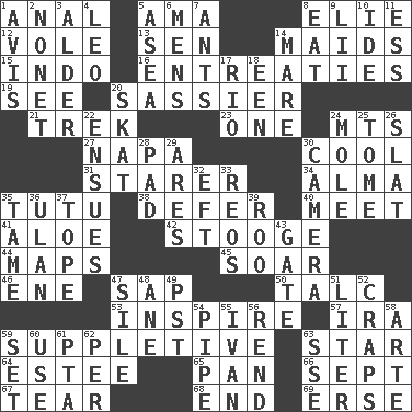 ACROSS 1. Of or related to the anus 5. Wet nurse (var.) 8. Writer Wiesel 12. Short-tailed, large-bodied rat 13. Elected rep. 14. Women servants 15. Southeast Asian peninsula 16. Pleas 19. Observe 20. More disrespectful 21. Long journey 23. Single 24. Mountains (abbr.) 27. California wine valley 30. Calm and collected 31. A viewer who gazes fixedly 34. _ mater 35. Ballerina skirt 38. Postpone 40. Confront 41. _ vera 42. Moe Howard, for one 44. Atlas contents 45. Fly high 46. Compass dir. 47. Plant excrement 50. Baby powder 53. Motivate 57. Lyricist Gershwin 59. Supplying deficiencies 63. Play the lead 64. First name in cosmetics 65. Baking dish 66. Back-to-school mo. 67. Separate forcefully 68. Conclusion 69. Celtic language DOWN 1. Deliberation 2. Music written for nine 3. Tree or shrub in the Birch family 4. Lion 5. At sea 6. Not women's 7. Pismires 8. Consume 9. Cards in a Roman deck? 10. Binary compound 11. Curvy letter 14. Female horse 17. River (Sp.) 18. Car or cant ending 20. Three-handed card game 22. Takes place subsequently 24. Undercover agent 25. Heavy book 26. Narrow board 28. Groovy apt. 29. Ancient Greek god of war 30. Device for capturing images 32. Bank Draft (abbr.) 33. Vintage cars 35. Not wild 36. Uhlan (variant) 37. Drink excessively 39. Friend of Pooh 43. Yard entry 47. Filth; sediment 48. One (Scot) 49. Pacific Standard Time (abbr.) 51. 61 cubic inches 52. Dice game 54. Corncob 55. _ the terrible 56. Tear apart 58. Johnson of "Laugh-In" 59. Put into a specified state 60. Purpose 61. Parent Teacher Association (abbr.) 62. For each 63. Compass dir.