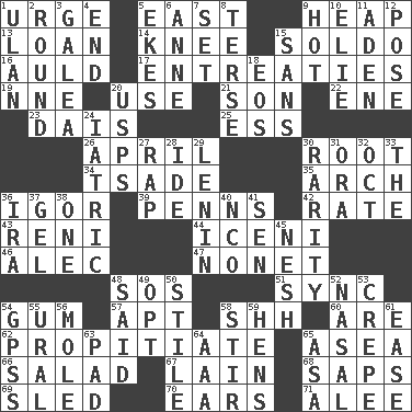 ACROSS 1. Goad 5. 90 degrees 9. Pile 13. Grant temporary use of 14. Leg joint 15. Twentieth part of a lira 16. Old (Scot.) 17. Pleas 19. Compass dir. 20. Purpose 21. Male offspring 22. Compass dir. 23. Raised platform 25. Curvy letter 26. Showery time 30. Carrot, for example 34. Sadhe (variant) 35. Bowlike part 36. Russian composer Stravinsky 39. Actor Sean's family 42. Pace 43. Painter Guido (1575-1642) 44. Ancient Celtic tribe of eastern Britain 46. Actor Baldwin 47. Music written for nine 48. Mayday 51. Synchronize (abbr.) 54. Chewing product 57. Fitting 58. Quiet! 60. "We ___ not amused" (Victoria) 62. Appease 65. Toward the sea 66. Vegetable dish 67. (Had) reclined 68. Plant excrements 69. Downhill vehicle 70. Hearing organs 71. Toward shelter DOWN 1. Uhlan (variant) 2. Single shot of ammunition 3. An organ shaped like a helmet 4. Conclude 5. Makes supply last 6. Singer Murray 7. Put into a specified state 8. Laconic 9. Being at a high temperature 10. Writer Wiesel 11. An important port of Yemen 12. Airs 15. Without 18. Greek goddess of the dawn 20. United States Postal Service (abbr.) 24. Of or pertaining to medicine 27. Strike 28. Binary compound 29. Soviet premier 1918-24 30. Noteworthy scarcity 31. Mouth or opening 32. Sep. follower 33. Definite Article 36. Lyricist Gershwin 37. Set 38. Single 40. Non-commissioned officer (abbr.) 41. Elected rep. 45. Soft 48. Expressed in words 49. Choose 50. Vertical member of a panel or frame 52. Relating to the nose 53. Streamer paper 54. Global Positioning Systems (abbr.) 55. Mountain range 56. Undercover agent 58. Agitate 59. Coop moms 61. Relaxation 63. Writing tablet 64. American Automobile Association (abbr.) 65. White ___ sheet