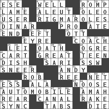 ACROSS 1. Compass dir. 4. Water source 8. Play 12. Unable to walk 14. Native American of Southwest Alaska 16. Butter sub 17. One who makes use of a thing 18. Frustrating wastes of time 20. Middle Eastern gold or silver currency 22. Adept person 23. Had dinner 24. Conclude 25. Bank Draft (abbr.) 28. Baseball player Mel 30. Jane of fiction 31. Team commander 35. Luau accessory 37. Pledge 40. Legendary monster 41. Heavy open wagon 42. Relatively large 44. Adolescent 45. Food container 46. Indian skirt 47. Compass dir. 48. Contemptuous expression 50. Actor Griffith 52. Director Reiner 54. Portuguese money of account (variant) 55. Remaining after all deductions 58. Curvy letter 61. Insect wing 63. Trap for birds or small mammals 65. Form of transportation 70. Nursemaid 71. Located in or toward the back 72. Lessep's creation 73. Immoral or dissolute person 74. Synchronize (abbr.) 75. Bar bills 76. Pass on DOWN 1. Evade 2. Indian antelope 3. Make improvements or corrections to 4. Armed conflict 5. Biblical high priest 6. Part of a journey 7. Mass 8. Friend of Pooh 9. Spanish pot 10. Confront 11. Airs 13. Period 15. Pacific island yam 19. College mil. group 21. Marina Del _, California 26. Tree-dwelling hopper 27. Rends 29. Tootsie (variant) 30. One or the other 32. Matures 33. Ship's personnel 34. Layer 35. (Had) reclined 36. Celtic language 38. Afternoon social gathering 39. Ethiopian city, capital of Harari 41. Music discs 43. Prong on a fork 49. Wander aimlessly 51. Lair 53. Group of countries in special alliance 55. Wanderer 56. 1973 Nobel Price Winner (Physics) Leo 57. Giggle 58. Hearing organs 59. Chop _ 60. Comedian Laurel of Laurel & Hardy 62. Blind as ____ 64. Rowing implement 66. The grampus (Milton) 67. _ tizzy (2 wds.) 68. Experiment locale 69. Raised railways