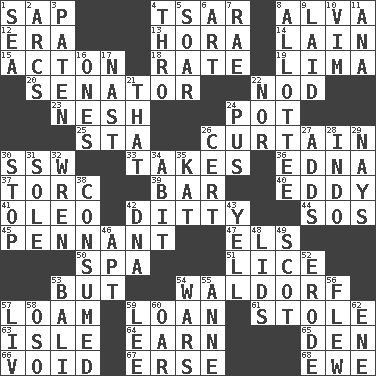 ACROSS 1. Plant excrement 4. Russian ruler of old 8. Inventor's middle name 12. Epoch 13. Israeli folk dance 14. (Had) reclined 15. NE Massachussets city 18. Pace 19. Pale green bean 20. Legislator 22. Allow head to fall sleepily 23. Tender 24. Plant holder 25. R.R. building 26. Window treatment 30. Compass dir. 33. Receives possession of 36. Pulitzer Prize-winning author Ferber 37. Torque (variant) 39. Soap unit 40. Whirlpool 41. Butter sub 42. Simple song 44. Mayday 45. Pre-World Series prize 47. Raised railways 50. Health resort 51. Louse (plural) 53. On the contrary 54. Apple salad 57. Rich soil 59. Grant temporary use of 61. Fur scarf 63. Small island 64. Merit 65. Lair 66. State of nonexistence 67. Celtic language 68. She-sheep DOWN 1. Ocean 2. Curves 3. Eucharist need 4. Through, poetically 5. Fly high 6. Nonscientific branch of learning 7. Actress Charlotte 8. One to whom something is allotted 9. Put down 10. Zeal 11. Santa ___, CA 16. Washington bills 17. Political cartoonist Thomas 21. Not this but _ 22. And not 24. Product of festering 26. An absolute certainty 27. Does sums 28. Southeast Asian peninsula 29. Negative votes 30. Cease 31. Not divided or shared with others 32. Songbird 34. "This won't hurt ____!" 35. Krazy ___ of comics 38. Ingested 42. Heredity factor (abbr.) 43. Shout 46. Fitting 48. Flaplike coverings 49. Native of Scotland 52. Wear away 53. Indonesian resort city 54. Armed conflicts 55. Queen of England 1702-14 56. Soared 57. 54 in ancient Rome 58. Bear (Spanish) 59. Area sheltered from the wind 60. Rowing implement 62. Compass dir.