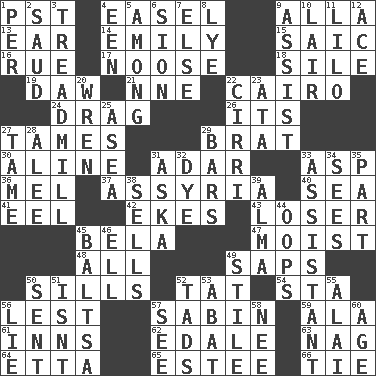 ACROSS 1. Pacific Standard Time (abbr.) 4. Artist's stand 9. Silent film actress Nazimova 13. Ewer handle 14. Poet Dickinson 15. Ketch in the Levant 16. Regret 17. Trap for birds or small mammals 18. Drop; flow; fall 19. Obsolete 21. Compass dir. 22. Capital of Egypt 24. To trail on the ground 26. It is 27. Makes less strong or intense 29. Naughty child 30. Place in a line 31. The sixth month of the Jewish calendar 33. Viper 36. Cartoonist voice _ Blanc 37. Nineveh was its capital 40. Ocean 41. Snakelike fish 42. Makes supply last 43. Failure 45. Actor Lugosi 47. Wet 48. Everything 49. Plant excrements 50. Beverly of Met fame 52. Make lace 54. R.R. building 56. For fear that 57. Unit of acoustic absorption 59. According to 61. Restaurants 62. Peak District village in England 63. Tired old horse 64. Singer James 65. First name in cosmetics 66. Make a knot DOWN 1. For each 2. Saudi Arabian king (1953-1964) 3. Excercise machine 4. Car or cant ending 5. Amid 6. The Jewish people; Israel 7. Otherwise 8. Sodium hydroxide 9. Help 10. Den 11. _ and Stitch 12. Adept person 20. Songbird 22. High-altitude cloud 23. "One Day ___ Time" 25. At sea 27. Not wild 28. Toward shelter 29. Taverns 31. "____ silly question..." 32. Color 33. Helper 34. Perceives with the eye 35. Component 38. Exchanges for money 39. _ mater 44. I made a mistake 45. Greek mezzo-soprano Agnes 46. Pipe bend 49. Vertical member of a panel or frame 50. Transmitted 51. Is not 52. Small boys 53. Blind as ____ 55. Jai _ 56. Whopper 57. Perceive with the eye 58. Born 60. Mature