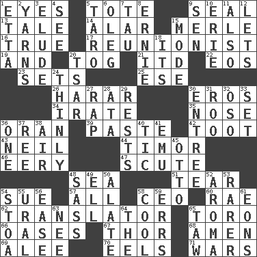 ACROSS 1. Snake ____ (dice throw) 5. Carry 9. Lick closed 13. Story 14. Having or resembling wings 15. Haggard of country music 16. Loyal 17. One who advocates reunion 19. Plus 20. Coat; cloak 21. It would 22. Greek goddess of the dawn 23. Puts into a specified state 25. Compass dir. 26. Ethiopian city, capital of Harari 30. Greek god of love 34. Feeling or showing extreme anger 35. Characteristic smell of wine 36. NW Algerian seaport 39. Thick mixture 42. A blast of a horn 43. Famous astronaut Armstrong 44. Southeast Indonesia island 46. Suggestive of the supernatural 47. Scutum 48. Ocean 51. Pull apart 54. Institute legal proceedings 57. 100% 58. Corporate head (abbr.) 60. Actress Charlotte 62. Interpreter 65. "Corrida" creature 66. Fertile tracts in a desert 67. Son of Odin 68. So be it 69. Toward shelter 70. Snakelike fish 71. Armed conflicts DOWN 1. Singer James 2. Entertaining tales 3. Evade 4. Perceive with the eye 5. Pacific island yam 6. Cassini of fashion 7. The 19th letter of the Greek alphabet 8. Bert's buddy 9. Elected rep. 10. One of the Great Lakes 11. In addition 12. Allows 15. Method 18. ___ a Wonderful Life 20. Russian ruler of old 24. Without viscosity 27. Strike 28. "One Day ___ Time" 29. Musical pauses 30. Main course 31. Friend of Pooh 32. Bear (Spanish) 33. Put into a specified state 36. Single 37. To sift 38. Atmosphere 40. Nervous spasm 41. Australian flightless bird 45. Von Bismarck 48. Backtalk 49. Pipe bend 50. Having winglike extensions 52. Odor 53. More valued for its uncommonness 54. Portico 55. Mountain range 56. Relaxation 58. Calm and collected 59. Blunders 61. Immeasurably long periods of time 63. Born 64. Definite Article 65. The 23rd letter of the Hebrew alphabet