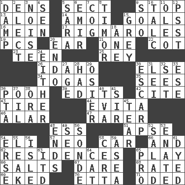ACROSS 1. Hiding places for outlaws 5. Religious group 9. Halt 13. Medicinal plant 14. Mine, in Marseilles 15. Purposes of endeavors 16. Chow _ 17. Frustrating wastes of time 19. Personal Computers (abbr.) 20. Hearing organ 21. Single 22. Small bed 23. Adolescent 25. Marina Del _, California 26. Potato state 30. Otherwise 34. Ancient Roman robes 35. Perceives with the eye 36. "Silly old bear" 39. Proofreads 42. Quote 43. Become fatigued 44. Webber/Rice musical 46. Having or resembling wings 47. More uncommon 48. Double-curved letter 51. Domed church section 54. Connecticut Ivy Leaguer 57. Modern: prefix 58. 4-wheeled motor vehicle 60. Added to 62. Dwellings 65. Romp 66. Table seasonings 67. Have the gumption 68. Assign a rank or rating to 69. Made supply last 70. Singer James 71. Wrote a lyric poem DOWN 1. Moist 2. Opt 3. Annoying sound 4. Elected rep. 5. "Two Mules for Sister ____" 6. Arab leader 7. Gear tooth 8. The easternmost of the Lesser Sundas 9. "Barney Miller" actor Jack 10. Baby powder 11. Butter sub 12. Inconspicuous attention getter 15. Jennifer or Joel 18. A saturated hydrocarbon 20. Inside; within (prefix) 24. One or the other of two 27. Grow older 28. Possessed 29. Flexible twig of a willow tree 30. Fortification 31. Luau accessory 32. Put into a specified state 33. Compass dir. 36. Parent Teacher Association (abbr.) 37. Lubricate 38. Mouth or opening 40. Federal power corp. 41. Title for a knight 45. Pull apart 48. Extremities 49. Perceive with the eye 50. Message 52. Vegetable dish 53. Maternal 54. Celtic language 55. Path through which fluid escapes 56. Small island 58. Sure thing 59. Toward the sea 61. Colored 63. It would 64. Domesticated feline 65. Adept person
