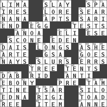 ACROSS 1. Pale green bean 5. Kill 9. Health resort 12. Angers 13. Old wives' tales, e.g. 14. Scorch 15. Grandmother 16. Tenement units (abbr.) 17. Indian skirt 18. Conclude 19. Oval reproductive body of a fowl 21. Trials 22. Small Philippine buffalo 24. Biblical high priest 26. Compass dir. 27. Biscuitlike quick bread 28. Paradise 29. Raised platform 30. Yearns 32. American tennis player Robert 36. Johnson of "Laugh-In" 37. Girls' org. (abbr.) 38. Leaves 39. Negative votes 40. Plays smoothly or legato 42. Blunders 43. Relationship diagram 44. Portable shelters 46. Small moist lump or mass 49. To free from 50. Opposed to 51. Dark wood 53. Before (prefix) 54. Scottish cap 57. Prong on a fork 58. Russian ruler of old 61. Grain storage tower 62. Pulitzer Prize-winning author Ferber 63. Swiss mountan, "Queen of the Mountains" 64. Frog relative 65. Portuguese money of account (variant) 66. A distinct part 67. Singer Murray DOWN 1. Actor's bit 2. SW Asia republic 3. Ananias' fault 4. White ___ sheet 5. Volcanic refuse 6. Trim (branches) 7. Nonscientific branch of learning 8. It is so 9. Gospel singer Marvin 10. Components 11. Ascend 14. Compass dir. 19. Period of immesurable duration 20. Highlander 21. Metal container 23. Olfactory organs 24. _ Allan Poe 25. French article 27. "Two Mules for Sister ____" 28. Take place subsequently 29. One of the 12 tribes of Israel 31. Stared at amorously 32. Rep 33. Decision 34. Possessive pronoun 35. Double-curved letter 40. _ Lanka 41. Play the lead 43. Attempt 45. Compass dir. 46. Prevent from occurring 47. Remain 48. Maid-servant 52. Teachers' org. 53. Demure 55. ____ Jay Lerner 56. Method 58. Three (prefix) 59. Be seated 60. Ripen 61. R.R. building