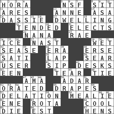 ACROSS 1. Israeli folk dance 5. Science/research agcy. 8. Be seated 11. Ancient Greek god of war 12. Queen of England 1702-14 13. White ___ sheet 14. Hyrax 17. Residence 19. Looked after 21. Chooses 22. Grandmother 23. Actress Charlotte 24. Frozen water 27. Political cartoonist Thomas 29. Dripping 32. Gospel singer Marvin 34. Period 36. Celtic language 37. Suttee (variant) 38. Pet locale 39. Scorch 40. One who makes use of a thing 41. Small drink 42. Writing tables 43. Car or cant ending 44. Separate forcefully 46. Neckwear 47. Nursemaid (var.) 50. The sixth month of the Jewish calendar 52. Spoke pompously 55. Window treatments 57. Accusation by an informer 59. Ear of corn 62. Compass dir. 63. Roll call or roster of names 64. Calm and collected 65. Expire 66. Eastern Standard Time (abbr.) 67. Coop moms DOWN 1. Possessed 2. Mouth or opening 3. Repose 4. NE Netherlands city 5. Compass dir. 6. Contemptuous expression 7. Man or boy (slang) 8. Ketch in the Levant 9. Is not 10. Labels 12. Increase 15. Lacking in sense or substance 16. Pulitzer Prize-winning author Ferber 18. Area sheltered from the wind 20. Artist's stands 24. Come out of 25. Stop 26. Ingested 28. Distinguishing feature 29. Take or capture by force 30. 1973 Nobel Price Winner (Physics) Leo 31. Laconic 33. Title for a knight 35. Become visible 36. Compass dir. 42. Window treatment 45. First man 47. _ moment's notice (2 wds.) 48. Distance measurement (Brit.) 49. Goodbye (Sp.) 51. Arrive at 52. Wrote a lyric poem 53. Painter Guido (1575-1642) 54. Toward shelter 55. Heredity factor (abbr.) 56. A type of plum 58. Baseball player Mel 60. Electrically charged atom 61. Raised railways