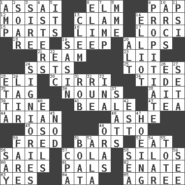 ACROSS 1. Slender Brazilian palm 6. Shade tree 9. Infant food 12. Damp 13. Burrowing marine mollusk 14. Blunders 15. Pieces 16. Citrus frut 17. Venues 18. Portuguese money of account (variant) 19. Ooze 20. High mountains 21. 480, 500 or 516 sheets of paper 23. Cards in a Roman deck? 24. Fast planes 25. Hauls 28. Biblical high priest 30. High-altitude cloud 34. Event that recurs at intervals 35. Label 36. Parts of speech 38. Small island 39. Prong on a fork 41. Memphis, Tenn. Street 43. Afternoon social gathering 44. Believer in; advocate of (suffix) 46. American tennis player Robert 48. Bear (Spanish) 49. Von Bismarck 50. Flintstone 51. Long, evenly shaped pieces 53. Erode 56. Travel by water 57. Root beer relative 58. Grain storage towers 60. Ancient Greek god of war 61. Friends 62. Maternal 63. Consenting reply 64. "One Day ___ Time" 65. Match DOWN 1. Electrical Unit 2. Fly high 3. Male parent of an animal 4. Michaelmas daisies 5. ___ a Wonderful Life 6. Writer Wiesel 7. Desk light 8. Madame (abbr.) 9. Conciliate 10. Arches 11. Air pressure measure (abbr.) 13. Clement's nick name 14. American author Paul (1891-1958) 19. Indian antelope 20. The first octave above the treble staff 22. And so on (abbr.) 24. Seigniories (variant) 26. Singer Brickell 27. Bristle 28. Singer James 29. Den 31. Director Reiner 32. Sorrow 33. _ tizzy (2 wds.) 37. Narrow boards 40. Artist's stands 42. Eastern Standard Time (abbr.) 45. Lower and raise head in agreement 47. Cultivating 49. Mouths or openings 50. Conductor's collection 51. Water vessel 52. Silent film actress Nazimova 54. Having or resembling wings 55. Lug 56. Declare 57. Numbers guy (abbr.) 58. Ocean 59. Observe
