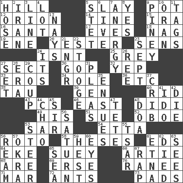 ACROSS 1. Land elevation 5. Kill 9. Plant holder 12. Greek mythologigal hunter 14. Prong on a fork 15. Retirement account (abbr.) 16. Before Barbara or Clara 17. Nights before holidays 18. Tired old horse 19. Compass dir. 20. Last past 23. Elected reps. 24. Is not 25. Jennifer or Joel 27. Religious group 30. Republican Party 32. Slangy assent 33. Greek god of love 34. Hero or heavy, e.g. 36. And so on (abbr.) 38. The 19th letter of the Greek alphabet 39. Commissioned military rank (abbr.) 40. To free from 43. Personal Computers (abbr.) 46. Compass direction 48. "You Light Up My Life" star Conn 49. Part of HMS, perhaps 51. Take to court 52. Mitch Miller's instrument 53. "Two Mules for Sister ____" 54. Singer James 56. Printing process, for short 58. College papers 61. Begley and Asner 64. Make supply last 65. Chop _ 66. Nick name for Arthur 68. "We ___ not amused" (Victoria) 69. Celtic language 70. The wife of a rajah (variant) 71. Third mo. 72. Pismires 73. Groovy apts. DOWN 1. Stockings 2. SW Asia republic 3. Actor's bit 4. Car dealer's back yard 5. Proofreading order 6. Not recorded 7. Disorder of the immune system 8. It is so 9. Abounding in pines 10. NW Algerian seaport 11. Labels 13. Negative votes 21. Engineer (abbr.) 22. Moe Howard, for one 23. Back-to-school mo. 24. ___ a Wonderful Life 26. Portuguese money of account (variant) 27. Arrange properly for use 28. Epoch 29. Overturn; upset 31. Entreaties 35. Takes place subsequently 37. Baby bed with high sides 41. Wedding promise 42. Expire 44. US Secretary of Labor Elaine L. _ 45. Title for a knight 47. False hair 48. ___ good deed 50. Titan orbits this 53. Navigate 55. Russian ruler of old 56. 480, 500 or 516 sheets of paper 57. Gumbo ingredient 59. Command 60. Snake ____ (dice throw) 61. Inactive volcano in Sicily 62. Passed on 63. Observes 65. Ocean 67. Strike