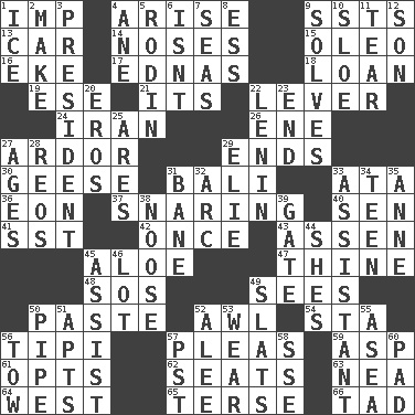 ACROSS 1. Mischievous child 4. Originate 9. Fast planes 13. 4-wheeled motor vehicle 14. Olfactory organs 15. Margarine 16. Supplement with great effort 17. Ferber et al. 18. Grant temporary use of 19. Compass dir. 21. ___ a Wonderful Life 22. Crowbar 24. SW Asia republic 26. Compass dir. 27. Zeal 29. Extremities 30. Honkers 31. Indonesian resort city 33. "One Day ___ Time" 36. A really long time 37. Catching in a trap 40. Elected rep. 41. Fast jet (abbr.) 42. At one time in the past 43. NE Netherlands city 45. _ vera 47. One or ones belonging to thee 48. Distress signal 49. Observes 50. Thick mixture 52. Leather borer 54. R.R. building 56. Native american tent (variation) 57. Entreaties 59. Cleo's killer 61. Chooses 62. Theater features 63. Teachers' org. 64. Compass direction 65. Laconic 66. Small boy DOWN 1. Frozen water 2. Cause to be 3. Elected leader of a country 4. One (Scot) 5. "The Thinker" sculptor 6. Is not 7. Oceans 8. Curvy letter 9. Finds the solution 10. A type of plum 11. Pull into pieces 12. Male child 20. Greek god of love 22. Soviet premier 1918-24 23. Conclusion 25. Ancient Greek god of war 27. Grows older 28. Vintage cars 29. Writer Wiesel 31. Object of repulsion 32. Curve 33. Helper 34. Adolescent 35. Queen of England 1702-14 38. Trap for birds or small mammals 39. Yard entry 44. "______ My Girl" (Turtles hit) 45. Help 46. Car dealer's back yard 49. Narrow boards 50. Corncob 51. Flats, for short 52. Toward shelter 53. Erode 55. At sea 56. Pull behind 57. Pacific Standard Time (abbr.) 58. Compass dir. 60. Groovy apt.