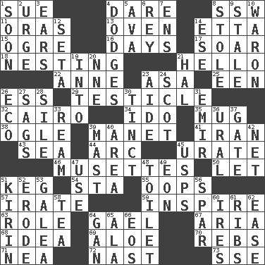 ACROSS 1. Institute legal proceedings 4. Have the gumption 8. Compass dir. 11. Mouths or openings 13. Baking chamber 14. Singer James 15. Legendary monster 16. 24-hour periods 17. Fly high 18. Inhabiting a nest 21. Phone greeting 22. Queen of England 1702-14 23. White ___ sheet 25. Car or cant ending 26. Double-curved letter 29. One of the two male reproductive glands 32. Capital of Egypt 34. Wedding promise 35. Large cup 38. Stare 39. French painter Edouard 41. SW Asia republic 43. Ocean 44. Curve 45. A salt of uric acid 46. French bagpipes 50. Allow 51. Cask 54. R.R. building 55. I made a mistake 57. Feeling or showing extreme anger 59. Heighten or intensify 63. Hero or heavy, e.g. 64. Highlander 67. Operatic vocal solo 68. It may be bright or harebrained 69. _ vera 70. Confederate soldiers (slang) 71. Teachers' org. 72. Political cartoonist Thomas 73. Compass dir. DOWN 1. Within a short period 2. Goad 3. Hearing organs 4. Evades 5. Actress Gardner 6. Marina Del _, California 7. Followers of ems 8. Fur scarf 9. Having lost freshness 10. Make _____ (do battle with) 12. Bristle 14. Compass dir. 19. To the inside or interior of 20. Compass dir. 21. Actor Linden 23. Helper 24. Highlander 26. Environmental prefix 27. Settles 28. Drop; flow; fall 30. Tinged 31. Arab leader 33. 480, 500 or 516 sheets of paper 36. Mountain range 37. Yard entry 39. Vertical spar for supporting sails 40. Type of rug 42. Fish or hair follower 45. United States Postal Service (abbr.) 47. Purpose 48. Bathroom plumbing fixture 49. A really long time 51. Japanese brewing company 52. Wear away 53. An organ shaped like a helmet 56. Practice fight 58. Beverage made from leaves 60. Angers 61. Teases 62. Comfort 64. Separate the seeds from cotton 65. In the manner of 66. Greek goddess of the dawn