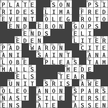 ACROSS 1. Food holder 6. Male child 9. 23rd letter of the Greek alphabet 12. Amusement-park features 13. Pale green bean 14. Flintstone 15. Happening 16. Cassini of fashion 17. Printing process, for short 18. Conclude 19. Inky black, to poets 20. Republicans 21. Conclusions 23. Connecticut Ivy Leaguer 24. Genesis locale 25. 61 cubic inches 28. Groovy apt. 30. Make _____ (do battle with) 34. Quote 35. Cuckoo 36. Inhabitant of Heaven 38. Santa ___, CA 39. Ear part 41. Entreaties 43. Scottish cap 44. Shopping centers 46. Ancient Persian 48. Raised railways 49. Rend 50. A single undivided whole 51. Indian titles of respect 53. Deep reverence 56. Butter sub 57. Soon (poet.) 58. Practice fights 60. Political cartoonist Thomas 61. Filth; sediment 62. Laconic 63. Followers of ems 64. Had dinner 65. NE Netherlands city DOWN 1. Before (prefix) 2. Moving, as bait 3. Arabian gulf 4. Looked after 5. Eastern Standard Time (abbr.) 6. Grain storage tower 7. Sign of something about to happen 8. Tired old horse 9. Conciliate 10. Arranges properly for use 11. Wedding promise 13. Tennis shots 14. Romp 19. Ferber et al. 20. Set 22. ___ Haven, CT 24. The property of being fit to eat 26. Inactive volcano in Sicily 27. 480, 500 or 516 sheets of paper 28. Inside of hand 29. Small Philippine buffalo 31. Reproach for some lapse or misdeed 32. Petroleum 33. Compass dir. 37. Softens 40. American author Paul (1891-1958) 42. Ocean 45. Fast jet (abbr.) 47. Window treatments 49. Prong on a fork 50. Uhlan (variant) 51. In a ____ (agitated or irritated) 52. Hero or heavy, e.g. 54. Armed conflicts 55. Celtic language 56. Single 57. White ___ sheet 58. R.R. building 59. Elected rep.