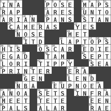 ACROSS 1. _ tizzy (2 wds.) 4. Airs 8. Atlas contents 12. Strike 13. Ancient Greek god of war 14. To (old English) 15. Believer in; advocate of (suffix) 18. Baking dishes 19. Comedian Laurel of Laurel & Hardy 20. Devices for capturing images 22. It is so 23. Characteristic smell of wine 24. Was introduced to 25. It would 26. Portable computers 30. Part of HMS, perhaps 33. Witty Wilde 36. Singer Brickell 37. Mild oath 39. Scottish cap 40. Back-to-school mo. 41. Australian parrot (variant) 42. Likely to tip or tilt 44. Ocean 45. Hard copy producer 47. Epoch 50. Commissioned mil. rank 51. Grant temporary use of 53. Basketball assoc. 54. Normal relaxed breathing 57. Small Philippine buffalo 59. Arranges properly for use 61. Kind of red light 63. Confront 64. False hair 65. Car or cant ending 66. Friends 67. Having or resembling wings 68. Actress Charlotte DOWN 1. Retirement account (abbr.) 2. Drug cop 3. Bee-related 4. Dad 5. Mouths or openings 6. Elected rep. 7. Curvy letter 8. French bagpipes 9. Pismires 10. Parent Teacher Association (abbr.) 11. Boy, to dad 16. Mine, in Marseilles 17. A home for chicks 21. Redecorate 22. Slangy assent 24. Spoil 26. Desk light 27. Lyric poems 28. Corncob 29. Bristle 30. Aid 31. Russian composer Stravinsky 32. Indian skirt 34. Use a spoon 35. Head covering 38. Empty-headed or silly people 42. Nine, plus one 43. Sharp bark 46. Beverage made from leaves 48. Painter Guido (1575-1642) 49. Soon (poet.) 52. Put off 53. Christmas carol 54. Singer James 55. One who makes use of a thing 56. Type of rug 57. Electrical Unit 58. Teachers' org. 59. R.R. building 60. Snakelike fish 62. A saturated hydrocarbon
