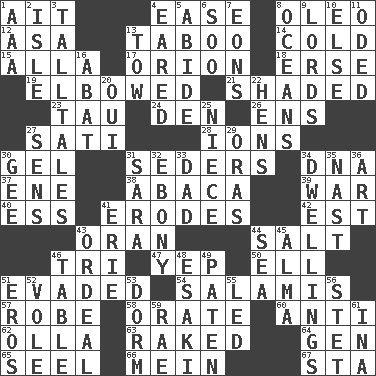 ACROSS 1. Small island 4. Comfort 8. Margarine 12. White ___ sheet 13. Off limits 14. Chilled 15. Silent film actress Nazimova 17. Constellation of myth 18. Celtic language 19. Shoved, as through a crowd 21. Cast a shadow over 23. The 19th letter of the Greek alphabet 24. Lair 26. Followers of ems 27. Suttee (variant) 28. Charged particles 30. Set 31. Spring feasts 34. Heredity factor (abbr.) 37. Compass dir. 38. Phillipine bananalike plant 39. Armed conflict 40. Double-curved letter 41. Eats (away) 42. Eastern Standard Time (abbr.) 43. NW Algerian seaport 44. Table seasoning 46. Three (prefix) 47. Slangy assent 50. Pipe bend 51. Eluded 54. Deli grouping 57. Loose flowing garment 58. Speak pompously 60. Opposed to 62. Spanish pot 63. Moved through 64. Commissioned military rank (abbr.) 65. Sew up the eyelids of hawks and falcons 66. Count _ (2 wds.) 67. R.R. building DOWN 1. American Automobile Association (abbr.) 2. Capri or Wight 3. Baron Munchausen's specialties 4. Having ears or earlike features 5. Tolerate 6. "Barney Miller" actor Jack 7. Immeasurably long periods of time 8. Seas 9. Domineers 10. Otherwise 11. Wrote a lyric poem 13. Pull behind 16. Blind as ____ 20. Fr. "Yes" 22. Coop moms 25. Sibling's daughter 27. Elected reps. 29. Mouths or openings 30. Unit of force equal to gravity 31. "Two Mules for Sister ____" 32. Black 33. June honoree 34. Homes 35. Political cartoonist Thomas 36. Nonscientific branch of learning 41. 4th largest of the Great Lakes 43. Severe or trying experience 44. Ocean 45. _ mater 46. Eating place 48. 1973 Nobel Price Winner (Physics) Leo 49. Eucharist need 51. Greek god of love 52. Short-tailed, large-bodied rat 53. Dormintory (informal) 55. Directed 56. Proofreading order 59. Actress Charlotte 61. _ tizzy (2 wds.)