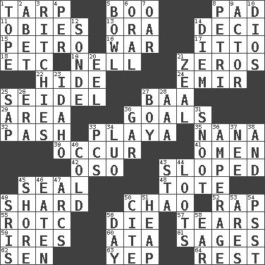 ACROSS 1. Canvas cover 5. Surprise greeting 8. Writing tablet 11. Off-Broadway awards 13. Mouth or opening 14. Tenth: prefix 15. Stone: prefix 16. Armed conflict 17. "Tell ____ the Marines!" 18. And so on (abbr.) 19. 1994 drama film starring Jodie Foster 21. Nothings 22. Flintstone garb 24. Independent ruler or chieftain 25. A glass for beer 27. Sound made by sheep 29. Type of rug 30. Purposes of endeavors 32. Romantic infatuation 33. Beach, in Buenos Aires 35. Nanny 39. Come to pass 41. Presage 42. Bear (Spanish) 43. Inclined 45. Lick closed 48. Haul 49. Pottery fragment 50. US Secretary of Labor Elaine L. _ 52. Strike 55. College mil. group 56. Pass on 57. Pulls into pieces 59. Angers 60. "One Day ___ Time" 61. Gurus 62. Elected rep. 63. Slangy assent 64. Repose DOWN 1. Drink excessively 2. Collude with 3. Actors Guy, Robert Welles, and Clint 4. For each 5. Soup holder 6. Relating to the mouth 7. Rowing implement 8. _ dish (used to culture cells) 9. Thespian 10. "Vaya con ____" 12. Message 14. South Vietnam president (1954) 20. Snakelike fish 21. Ardor 23. Potato state 25. Plant excrement 26. Period 27. Male child 28. Auto club (abbr.) 30. Slender fish 31. Snob 33. Personal Computers (abbr.) 34. Nilotic language 36. Electrical Measurement 37. Born 38. Plus 40. Lacking warmth 43. R.R. building 44. Plunders 45. Dinah or Pauly 46. Consumed 47. Arches 49. Indian titles of respect 50. Quote 51. Pile 53. Ancient Greek god of war 54. Inconspicuous attention getter 56. 24 hours 58. Hearing organ