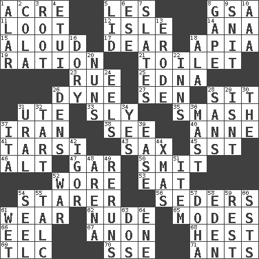 ACROSS 1. Measure of real estate 5. French article 8. Girls' org. (abbr.) 11. Spoils 12. Capri or Wight 14. Santa ___, CA 15. Verbally 17. Letter starter 18. Capital of Western Samoa 19. Food allowance for one day 21. Rest room 23. Sorrow 25. Pulitzer Prize-winning author Ferber 26. Centimeter-gram-second unit of force 27. Elected rep. 28. Be seated 31. Shoshoni 33. Mischievous 35. Box-office sellout 37. SW Asia republic 38. Perceive with the eye 40. Singer Murray 41. Tarsus (plural) 43. Saxophone 45. Fast jet (abbr.) 46. Keyboard modifier key 47. Slender fish 50. Stricken, poetically 52. Had on 53. Ingest 54. A viewer who gazes fixedly 56. Spring feasts 61. Put on (as clothing) 62. Unadorned 65. Methods 66. Snakelike fish 67. At once, immediately (arch.) 68. Command 69. Affectionate concern, for short 70. Compass dir. 71. Pismires DOWN 1. Having or resembling wings 2. Root beer relative 3. Carrot, for example 4. Needle holder 5. Hat (slang) 6. Compass dir. 7. Chalkboards 8. Open wide 9. In a ____ (agitated or irritated) 10. Auto club (abbr.) 13. Eat (away) 16. Dinghy 18. According to 20. Religious women 22. Lodging establishments 24. Snakelike fish 26. Habitations of wild animals 28. Without 29. Is not 30. Definite Article 31. Mountain range 32. Small pie 34. Affirmative reply 36. Vertical spar for supporting sails 37. Call ___ day 39. Comfort 42. Composer Stravinsky 44. Dec. holiday 48. Sports stadium 49. Summer TV shows 51. A distinct part 52. Armed conflict 54. Sew up the eyelids of hawks and falcons 55. Baby powder 57. Capital of the state of Qatar 58. Paradise 59. Respite 60. Fast planes 61. Dripping 63. Two (Sp.) 64. Compass dir.