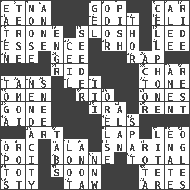 ACROSS 1. Inactive volcano in Sicily 5. Republican Party 8. Auto 11. A really long time 12. Prepare for publication 14. Connecticut Ivy Leaguer 15. Heavy duty weighing machine 17. Splash clumsily 18. Directed 19. Gist 21. 17th letter of the Greek alphabet 22. Area sheltered from the wind 23. Born 24. Unit of force equal to gravity 25. Hit sharply and swiftly 27. To free from 28. Burn to charcoal 31. Scottish caps 35. Luau accessory 37. Heavy book 38. Sign of things to come 39. River (Sp.) 41. Singles 42. Went 43. Retirement account (abbr.) 45. Monthly bill 46. Assistant 47. Raised railways 49. Nonscientific branch of learning 51. Pet locale 52. Lion 55. The grampus (Milton) 57. Wing 60. Catching in a trap 62. Luau course 63. Child's nurse 65. "_____ Recall" 66. Small child 67. Within a short period 68. False hair 69. Filthy place 70. The 23rd letter of the Hebrew alphabet 71. Ancient Greek god of war DOWN 1. Ingested 2. Laconic 3. Trap for birds or small mammals 4. Queen of England 1702-14 5. Set 6. Scent 7. Expression of disdain 8. Portable communications device 9. Toward shelter 10. Travel on or in a vehicle 13. Son of Odin 16. Engineer (abbr.) 17. Sowing specialist 20. To provide with a ceiling 26. Thespian 29. So be it 30. Relief 31. Ancient Roman robe 32. Mine, in Marseilles 33. Ananias' fault 34. Contemptuous expression 36. One more than two 40. Threatening words 44. ____ Jay Lerner 48. Argument over a trivial matter 50. Bar bills 52. 61 cubic inches 53. Related on the mother's side 54. Stares 55. Chooses 56. Carrot, for example 58. Plunder 59. Small Philippine buffalo 61. Roll call or roster of names 64. Compass dir.
