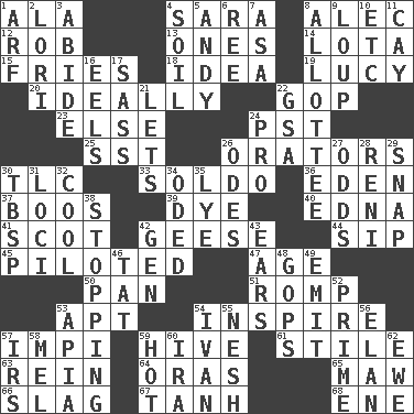 ACROSS 1. In the manner of 4. "Two Mules for Sister ____" 8. Actor Baldwin 12. Director Reiner 13. Washington bills 14. Globular water bottle used in Asia 15. Strips of potato fried in deep fat 18. The content of cognition 19. "I Love _" 20. Under perfect conditions 22. Republican Party 23. Otherwise 24. Pacific Standard Time (abbr.) 25. Fast jet (abbr.) 26. Speakers 30. Affectionate concern, for short 33. Twentieth part of a lira 36. Genesis locale 37. Expressions of contempt or scorn 39. Color 40. Pulitzer Prize-winning author Ferber 41. Native of Scotland 42. Honkers 44. Small drink 45. Manned the helm 47. Mature 50. Baking dish 51. Play 53. Fitting 54. Heighten or intensify 57. Body of Kaffir warriors 59. Hub of activity 61. Vertical member of a panel or frame 63. It's straight from the horse's mouth 64. Mouths or openings 65. Opening into something insatiable 66. Volcanic refuse 67. Hyperbolic tangent 68. Compass dir. DOWN 1. Sandy's bark 2. Australian parrot (variant) 3. Stay 4. Land 5. Actor Griffith 6. To separate or throw off 7. White ___ sheet 8. One to whom something is allotted 9. Central Nebraska county 10. And so on (abbr.) 11. Island 16. Snakelike fish 17. Backtalk 21. Allows 22. Girls' org. (abbr.) 24. Adept person 26. Lyric poems 27. Likelihood 28. Painter Guido (1575-1642) 29. Fastener 30. Cook's measure (abbr.) 31. Venues 32. Calm and collected 34. Wrote a lyric poem 35. Sodium hydroxide 38. Ceasing 42. Commissioned mil. rank 43. Hearing organs 46. Make lace 48. Republicans 49. Give off 52. A-one 53. Capital of Western Samoa 54. _ the terrible 55. Tender 56. Style 57. Big collection agency 58. Cartoonist voice _ Blanc 59. Being at a high temperature 60. Lyricist Gershwin 62. She-sheep