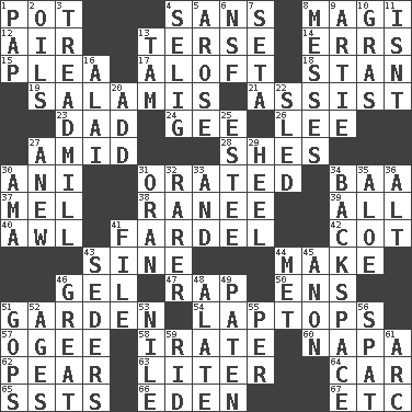 ACROSS 1. Cooking vessel 4. Without 8. Wise men 12. Atmosphere 13. Laconic 14. Blunders 15. Entreaty 17. High up in or into the air 18. Comedian Laurel of Laurel & Hardy 19. Deli grouping 21. Help 23. June honoree 24. Unit of force equal to gravity 26. Area sheltered from the wind 27. Among 28. "______ My Girl" (Turtles hit) 30. Cuckoo 31. Spoke pompously 34. Sound made by sheep 37. Cartoonist voice _ Blanc 38. Indian princess (variant) 39. 100% 40. Leather borer 41. Pack 42. Small bed 43. Trig term 44. Create 46. Set 47. Strike 50. Followers of ems 51. Place where plants grow 54. Portable computers 57. Double curve, resembling the letter S 58. Feeling or showing extreme anger 60. California wine valley 62. Lightbulb-shaped fruit 63. 61 cubic inches 64. 4-wheeled motor vehicle 65. Fast planes 66. Paradise 67. And so on (abbr.) DOWN 1. Infant food 2. Lubricates 3. Excercise machine 4. Former Milwaukee Brewers owner Bud 5. Came up 6. Science/research agcy. 7. Bristle 8. Makes clutter 9. Nick name for Arthur 10. Pate de foie ____ 11. Is not 13. Scottish cap 16. Jai ____ 20. Say or write further 22. Downhill vehicle 25. First name in cosmetics 27. Afresh 29. Person who is morally reprehensible 30. Nanny (var.) 31. NW Algerian seaport 32. More valued for its uncommonness 33. Added to 34. Keyboard key 35. Medicinal plant 36. Keyboard modifier key 41. Do some clerical work 43. Spring feasts 44. Was introduced to 45. At once, immediately (arch.) 46. Relatively large 48. Having winglike extensions 49. Eucharist need 51. Republicans 52. Grows older 53. Mediterranean tributary 55. For each 56. Argument over a trivial matter 59. To free from 61. Curve