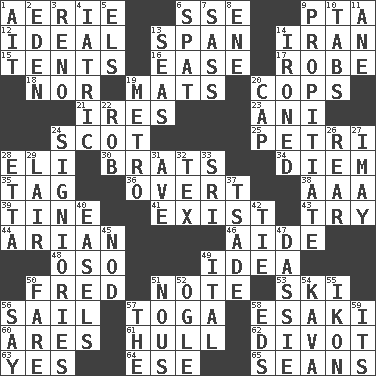 ACROSS 1. Nest on high 6. Compass dir. 9. Parent Teacher Assoc. 12. Standard of perfection 13. Connect, as a bridge 14. SW Asia republic 15. Portable shelters 16. Relaxation 17. Loose flowing garment 18. Not either 19. Floor protectors 20. 911 reaches them 21. Angers 23. Cuckoo 24. Highlander 25. _ dish (used to culture cells) 28. Biblical high priest 30. Naughty children 34. South Vietnam president (1954) 35. Label 36. Unconcealed 38. American Automobile Association (abbr.) 39. Prong on a fork 41. Be extant 43. Attempt 44. Believer in; advocate of (suffix) 46. Helper 48. Bear (Spanish) 49. The content of cognition 50. Flintstone 51. Short letter 53. What Jean-Claude Killy likes to do 56. Move on water 57. Ancient Roman robe 58. 1973 Nobel Price Winner (Physics) Leo 60. Ancient Greek god of war 61. Frame or body of a ship 62. A piece of turf (Scot.) 63. It is so 64. Compass dir. 65. Seines DOWN 1. Small island 2. Paradise 3. Former U.S. Attorney General Janet 4. Of or pertaining to medicine 5. Raised railways 6. Petty quarrel 7. Backtalk 8. Compass dir. 9. Conciliate 10. Bar bills 11. One (Scot) 13. Oceans 14. Pressed 19. Paris' subway 20. Head covering 22. Director Reiner 24. Seigniories (variant) 26. Stern 27. "If ____ say so..." 28. Singer James 29. Den 31. "___ Maria" 32. John Ritter's dad 33. Indian title of respect (Mr.) 37. Sadhe (variant) 40. Artist's stands 42. Standoff 45. Allow head to fall sleepily 47. Small ungulate mammals of Africa 49. Slanted text style (abbr.) 50. Conductor's collection 51. Good sense 52. Stare 54. Polynesian shrub of the pepper family 55. Picture 56. Declare 57. Definite Article 58. Begley and Asner 59. It is
