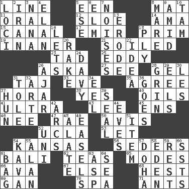 ACROSS 1. Actor's bit 5. Car or cant ending 8. Floor covering 11. Of the mouth 12. A type of plum 14. Nanny (var.) 15. Lessep's creation 17. Independent ruler or chieftain 18. Demure 19. More lacking in sense or substance 21. Dirtied 23. Small boy 25. Whirlpool 26. "____ silly question..." 27. Observe 28. Set 31. _ Mahal 33. Night before a holiday 35. Match 37. Israeli folk dance 38. It is so 40. Petroleums 41. Extremist 43. Area sheltered from the wind 45. Followers of ems 46. Born 47. Actress Charlotte 50. Opinion 52. Southern CA. univ. 53. Allow 54. Sunflower state 56. Spring feasts 61. Indonesian resort city 62. Beverages made from leaves 65. Methods 66. Actress Gardner 67. Otherwise 68. Behest 69. Separate the seeds from cotton 70. Health resort 71. Pismires DOWN 1. Event scenes 2. SW Asia republic 3. Nanny 4. Liveliness 5. Compass dir. 6. Shade tree 7. Annoying sounds 8. Female horse 9. Among 10. Scottish cap 13. Wear away 16. Allows 18. Apply oneself diligently 20. Immoral or dissolute person 22. The content of cognition 24. _ Jones' Locker 26. Partly open 28. Amused look 29. Snakelike fish 30. French article 31. Lacquered or enameled metalware 32. Johnson of "Laugh-In" 34. Snakelike fish 36. Moves 37. Attila the _ 39. Lick closed 42. Arches 44. Nights before holidays 48. Having winglike extensions 49. Artist's stands 51. A whole individual unit 52. University (slang) 54. Polynesian shrub of the pepper family 55. ____ Jay Lerner 57. Capital of the state of Qatar 58. Locale of original sin 59. Respite 60. Fast planes 61. Paper or plastic container 63. Cleo's killer 64. Ocean