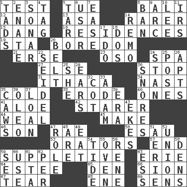 ACROSS 1. Trial 5. Third day of the wk. 8. Indonesian resort city 12. Small Philippine buffalo 13. White ___ sheet 14. More uncommon 15. Mild oath, euphamism for damn 16. Dwellings 19. R.R. building 20. Mood resulting from idleness 21. Celtic language 23. Bear (Spanish) 24. Health resort 27. Otherwise 30. Cease 31. New York city 34. Political cartoonist Thomas 35. Having a low temperature 38. Eat (away) 40. Washington bills 41. _ vera 42. A viewer who gazes fixedly 44. Welt 45. Cause to be 46. Boy, to dad 47. Actress Charlotte 50. He sold his birthright 53. Speakers 57. Conclude 59. Supplying deficiencies 63. 4th largest of the Great Lakes 64. First name in cosmetics 65. Lair 66. The Jewish people; Israel 67. Rend 68. Compass dir. 69. Elected reps. DOWN 1. Small amounts or degrees 2. Maternal 3. Underwater navigation system 4. Label 5. Edible starchy tuberous root 6. One who makes use of a thing 7. Comfort 8. Forbid 9. Curve 10. Area sheltered from the wind 11. Big collection agency 14. San ____ (Riviera town) 17. Wedding promise 18. Two (Sp.) 20. Waist strap 22. Beer mug 24. Comedian Laurel of Laurel & Hardy 25. Airs 26. Tenement units (abbr.) 28. A female animal or person 29. Hearing organs 30. Sounds asleep 32. Small bed 33. First of billions? 35. Crow sounds 36. Margarine 37. Grant temporary use of 39. Period 43. Supplements with great effort 47. Hero or heavy, e.g. 48. "We ___ not amused" (Victoria) 49. Consume 51. Nest on high 52. The state of being joined or united 54. Periodic rise and fall of the sea level 55. Baking chamber 56. French philosopher Descartes 58. Habitations of wild animals 59. Arrange properly for use 60. Purpose 61. Parent Teacher Association (abbr.) 62. For each 63. Double-curved letter