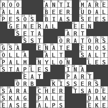 ACROSS 1. Friend of Pooh 4. Opposed to 8. Female horse 12. Wing 13. Fermented drink made from hops 14. Hereditary estate 15. Mexican monetary units 18. Prejudice 19. Observes 20. Commissioned military rank 22. Car or cant ending 23. Stalk of a moss capsule 24. Nonscientific branch of learning 25. Fast jet (abbr.) 26. Speakers 30. Girls' org. (abbr.) 33. Maternal 36. Greek god of love 37. Water jar 39. Keyboard modifier key 40. Table seasoning 41. Inside of hand 42. High-strength synthetic material 44. French article 45. Paper fasteners 47. _ tizzy (2 wds.) 50. Erode 51. Piece 53. Globe 54. Smoochers 57. "Two Mules for Sister ____" 59. "Mermaids" star 61. Sadhe (variant) 63. Heroin 64. Light colored 65. Obsolete 66. Comfort 67. High mountains 68. Make supply last DOWN 1. Reproach for some lapse or misdeed 2. Cassini of fashion 3. Fertile tracts in a desert 4. Swedish rock group 5. Famous astronaut Armstrong 6. Afternoon social gathering 7. Big collection agency 8. French bagpipes 9. An important port of Yemen 10. Actress Charlotte 11. Raised railways 16. Washington bills 17. Puts into a specified state 21. Assign a rank or rating to 22. Period 24. "We ___ not amused" (Victoria) 26. "Beetle Bailey" pooch 27. Relating to the mouth 28. Hero or heavy, e.g. 29. Fast planes 30. Republicans 31. Narrow board 32. Silent film actress Nazimova 34. Negative votes 35. 100% 38. Electrical Measurement 42. Remaining after all deductions 43. Cuts off 46. Experiment locale 48. Political cartoonist Thomas 49. Ancient Greek god of war 52. Buy and sell 53. Mouths or openings 54. Seaweed 55. Angers 56. Neighbor of Neb. 57. Compass dir. 58. Alias (abbr.) 59. Accounting whiz (abbr.) 60. Actor Linden 62. She-sheep