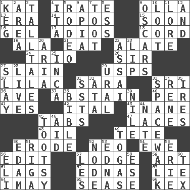 ACROSS 1. Krazy ___ of comics 4. Feeling or showing extreme anger 9. Spanish pot 13. Epoch 14. Literary convention 15. Within a short period 16. Set 17. Goodbye (Sp.) 18. Drawstring 19. In the manner of 21. Erode 22. Having winglike extensions 24. Musical group of three 26. Title for a knight 27. Killed 29. United States Postal Service (abbr.) 30. Pale purple color 31. "Two Mules for Sister ____" 33. Indian title of respect (Mr.) 36. "___ Maria" 37. Choose not to consume 40. For each 41. Consenting reply 42. Slanted text style (abbr.) 43. Empty; void 45. Bar bills 47. Shoestrings 48. Lubricate 49. False hair 50. Wear away 52. Modern: prefix 54. She-sheep 56. Prepare for publication 57. Inn 59. Tate display 61. Falls behind 62. Ferber et al. 63. Untruth 64. "If ____ say so..." 65. Gospel singer Marvin 66. Dry husk or covering DOWN 1. Cask 2. Type of rug 3. Baron Munchausen's specialties 4. Call ___ day 5. Cowboy competition 6. Capital of Western Samoa 7. A blast of a horn 8. Curvy letter 9. Motion picture awards 10. Spoils 11. Old wives' tales, e.g. 12. Added to 20. Operatic vocal solo 22. Slender Brazilian palm 23. Mouth edge 25. South American Indian 27. Kill 28. Moving, as bait 29. Mountain range 31. Fast planes 32. _ moment's notice (2 wds.) 33. High altitude stroll 34. French philosopher Descartes 35. Angers 38. Instruction Manual for Humans 39. "Death on the ____" 44. Nathan's nickname 45. Tootsie (variant) 46. Help 49. Ancient Roman robes 50. Dutch treat 51. Port city in Latvia 52. Connecting point 53. Pulitzer Prize-winning author Ferber 55. One of the Great Lakes 56. Biblical high priest 57. French article 58. Compass dir. 60. John Ritter's dad