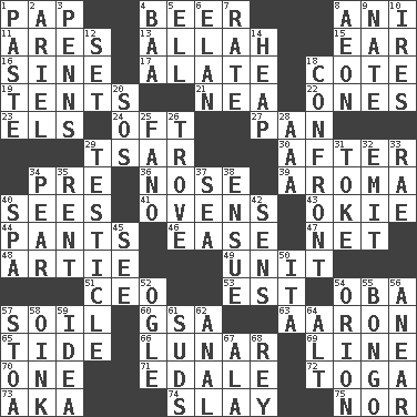 ACROSS 1. Infant food 4. Fermented drink made from hops 8. Black tropical American cuckoo 11. Ancient Greek god of war 13. Assad's deity 15. Ewer handle 16. Trig term 17. Having winglike extensions 18. ____ d'Azur (French Riviera) 19. Portable shelters 21. Teachers' org. 22. Washington bills 23. Raised railways 24. Often (poetically) 27. Baking dish 29. Russian ruler of old 30. Following 34. Before (prefix) 36. Olfactory organ 39. Scent 40. Perceives with the eye 41. Baking chambers 43. Migrant worker of the '30s 44. Leg coverings 46. Comfort 47. Fish or hair follower 48. Nick name for Arthur 49. A single undivided whole 51. Corporate head (abbr.) 53. Eastern Standard Time (abbr.) 54. Chief or king in Benin or Nigeria 57. The visible part of the earth's surface 60. Girls' org. (abbr.) 63. Composer Copland 65. Event that recurs at intervals 66. Type of eclipse 69. Actor's bit 70. Single 71. Peak District village in England 72. Ancient Roman robe 73. Alias (abbr.) 74. Kill 75. And not DOWN 1. Thick mixture 2. Satellite of Uranus 3. Actor Sean's family 4. Sound made by sheep 5. Pipe bend 6. Liveliness 7. Pace 8. Period of immesurable duration 9. Nathan's nickname 10. Angers 12. Arrange properly for use 14. Pile 18. Meet 20. Distress signal 25. Papal veil 26. Collection of objects 28. American Automobile Association (abbr.) 29. One of the two male reproductive glands 31. Puff or smoke 32. Send forth 33. Actress Charlotte 34. Lightbulb-shaped fruit 35. Monthly bill 37. Ocean 38. Follow as a consequence or result 40. Health resort 42. Elected reps. 45. Perceive with the eye 50. Call ___ day 52. Stare at amorously 54. Constellation of myth 55. Beat drum 56. Approach 57. Portico 58. Pig sound 59. It may be bright or harebrained 61. Beer foam 62. Of or related to the anus 64. The first octave above the treble staff 67. In the manner of 68. Marina Del _, California