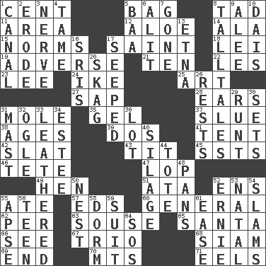 ACROSS 1. Penny 5. Paper or plastic container 8. Bit 11. Type of rug 12. Medicinal plant 14. According to 15. Typical standards 17. Inhabitant of Heaven 18. Luau accessory 19. Contrary to your interests or welfare 21. Nine, plus one 22. French article 23. Area sheltered from the wind 24. Eisenhower's nickname 25. Tate display 27. Plant excrement 28. Hearing organs 31. Undercover agent 35. Set 37. Turn sharply 38. Eons 39. Two (Sp.) 41. Portable shelter 42. Narrow board 43. Teat (slang) 45. Fast planes 46. Wig 47. Chop off 49. Layer 51. _ moment's notice (2 wds.) 52. Followers of ems 55. Had dinner 57. Begley and Asner 60. Commissioned military rank 62. For each 63. Lush 65. Before Barbara or Clara 66. Perceive with the eye 67. Musical group of three 68. Thailand, formerly 69. Conclude 70. Mountains (abbr.) 71. Snakelike fish DOWN 1. Lessep's creation 2. Wear away 3. Effrontery 4. Docile 5. Sound made by sheep 6. Came down and settled, as after flight 7. Went 8. Baron Munchausen's specialties 9. Toward shelter 10. Raised platform 13. Inactive volcano in Sicily 16. Indian titles of respect 17. Oozed 20. Heroin 26. Musical pauses 29. Undersized animal 30. Arranges properly for use 31. Vertical spar for supporting sails 32. Stare 33. Tough but pliablecoriaceous 34. First name in cosmetics 36. Car dealer's back yard 40. Fodder prepared in a silo 44. Haul 48. Zero-star reviews 50. A home for chicks 52. Bert's buddy 53. Relating to or accompanying birth 54. Hits or strikes with great force 55. Domed church section 56. Adolescent 58. Dormintory (informal) 59. Costume for a special activity 61. Relaxation 64. Mayday
