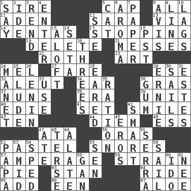 ACROSS 1. Beget 5. Head covering 8. Everything 11. Arabian gulf 12. "Two Mules for Sister ____" 13. By way of 14. Gossips 17. Obstructing or blocking passage 19. Keyboard key 21. Makes clutter 22. Writer of Portnoy's Complaint (1969) 23. Nonscientific branch of learning 24. Cartoonist voice _ Blanc 27. Conductor's collection 29. Compass dir. 32. Eskimo relative 34. Hearing organ 36. Pate de foie ____ 37. Religious women 38. Epoch 39. A single undivided whole 40. Singer Brickell 41. Put into a specified state 42. Grin 43. Nine, plus one 44. South Vietnam president (1954) 46. Curvy letter 47. "One Day ___ Time" 50. Mouths or openings 52. Soft color 55. Sounds asleep 57. Electrical Measurement 59. Put through a sieve 62. Sliced dessert 63. Comedian Laurel of Laurel & Hardy 64. Travel on an animal 65. Find the sum of 66. Car or cant ending 67. _ vera DOWN 1. Declare 2. Binary compound 3. Tear apart 4. Keyboard key 5. Domesticated feline 6. Scent 7. Some stationery 8. Deliberation 9. Actor's bit 10. Fails to keep up a pace 12. Compass dir. 15. Upward 16. Stalk of a moss capsule 18. Pacific Standard Time (abbr.) 20. Triads 24. French painter Edouard 25. Evade 26. Soviet premier 1918-24 28. Having ears or earlike features 29. Bert's buddy 30. Moves on water 31. _____ Park, CO 33. Purpose 35. Food allowance for one day 36. Chewing product 42. Don Adams' spy role 45. Greek god of love 47. Had dinner 48. Laconic 49. Having winglike extensions 51. Spanish missionary in California 52. Dad 53. Among 54. Broke a traffic law 55. Elected rep. 56. Move on water 58. Separate the seeds from cotton 60. Wedding promise 61. Born