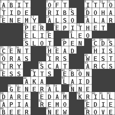 ACROSS 1. "This won't hurt ____!" 5. Often (poetically) 8. "Tell ____ the Marines!" 12. Periodic rise and fall of the sea level 13. Teases 15. Capital of the state of Qatar 16. Foe 18. In addition 19. Having or resembling wings 20. For each 22. Curse 24. Writer Wiesel 26. Lion 27. Position in a hierarchy or organization 28. Writing instrument 29. Music discs 32. Penny 35. Froth on beer 37. Part of HMS, perhaps 38. Mouths or openings 39. Big collection agency 40. Compass direction 41. Attempt 42. Jazz singing style 43. Arches 44. Double-curved letter 45. It is 46. Inky black, to poets 49. Alias (abbr.) 50. Put down 51. Commissioned military rank 55. Compass dir. 56. Have the gumption 57. Dutch treat 59. Shrimp-like planktonic crustaceans 63. Capital of Western Samoa 64. San ____ (Riviera town) 65. Singer Brickell 66. Fermented drink made from hops 67. ___ Haven, CT 68. Be footloose DOWN 1. Had dinner 2. Storage container 3. Binary compound 4. Storms 5. Mouth or opening 6. Do some clerical work 7. Cook's measure (abbr.) 8. Potato state 9. Lacquered or enameled metalware 10. Not this but _ 11. Boat paddle 14. Dirtied 17. Shout 21. River (Sp.) 23. Nine, plus one 25. Principles of right and wrong 28. Soft color 29. "Mermaids" star 30. Flat circle 31. Fast planes 32. ____ d'Azur (French Riviera) 33. Blunders 34. Negative votes 36. Epoch 40. Nomad 42. A viewer who gazes fixedly 45. Mamie's husband 47. Forbid 48. Pig sound 49. Approach 51. Stare wonderingly 52. One of the Great Lakes 53. Arabian gulf 54. Unable to walk 56. Pat or tap gently 58. Cut the grass 60. Wedding promise 61. 54 in ancient Rome 62. Area sheltered from the wind