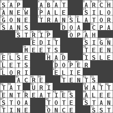 ACROSS 1. Plant excrement 4. Blind as ____ 8. Bowlike part 12. Afresh 14. Light colored 15. Grain storage tower 16. Went 17. Interpreter 20. Without 21. ___ good deed 22. Tax preparer (abbr.) 23. Long narrow piece of something 27. Brightly colored fish 29. Prepare for publication 31. Signal 34. Confronts 35. Adolescent 36. Otherwise 39. Possessed 41. Capri or Wight 42. Allows 43. Drug addict 46. Australian parrot (variant) 47. Writer Wiesel 48. Measure of real estate 51. Portable shelters 54. Make lace 56. RI univ. 58. Electrical Unit 61. Pleas 66. Toward shelter 67. Portico 68. Carryall 69. Comedian Laurel of Laurel & Hardy 70. Prong on a fork 71. At one time in the past 72. Fast jet (abbr.) DOWN 1. Settles 2. Small Philippine buffalo 3. Actor Sean's family 4. Fitting 5. Soap unit 6. Insect wing 7. Be inclined (to) 8. White ___ sheet 9. Actors Guy, Robert Welles, and Clint 10. Hoof sound 11. Israeli folk dance 13. 270 degrees 18. "Barney Miller" actor Jack 19. Pet locale 24. To sift 25. Binary compound 26. Essential or central part 28. Being in motion 30. Sadhe (variant) 32. Set 33. Compass dir. 34. Mesonic 36. Pipe bend 37. Lion 38. Ski resort town in Vermont 40. Dunce 44. Sliced dessert 45. Car or cant ending 49. Sorrow 50. Epoch 52. It was, poetically 53. Table seasonings 54. Trial 55. Opposed to 57. "Tell ____ the Marines!" 59. Beverages made from leaves 60. Portable shelter 62. Actress Charlotte 63. Electrically charged atom 64. And so on (abbr.) 65. Perceive with the eye