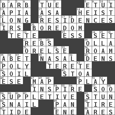ACROSS 1. Sharp remark 5. Third day of the wk. 8. Needle case 12. Capital of Western Samoa 13. White ___ sheet 14. Robbery 15. Protracted 16. Homes 19. Big collection agency 20. Mood resulting from idleness 21. False hair 23. Curvy letter 24. Arrange properly for use 27. Confederate soldiers (slang) 30. Spanish pot 31. Threatening words 34. Wander 35. Collude with 38. Rhinal 40. Cub Scout units 41. Many (prefix) 42. Cylindrical with tapered ends 44. Land 45. Portico 46. Compass dir. 47. Atlas unit 50. Romp 53. Stimulate to action 57. "Barney Miller" actor Jack 59. Supplementary 63. Astound 64. Slow-paced one 65. Baking dish 66. Become fatigued 67. Event that recurs at intervals 68. Compass dir. 69. Ancient Greek god of war DOWN 1. Indonesian resort city 2. To the left, to Queeg 3. Remove soap 4. Container for groceries 5. Edible starchy tuberous root 6. One who makes use of a thing 7. Relaxation 8. Car or cant ending 9. Nervous spasm 10. Purpose 11. It is 14. Is hesitant and indecisive 17. Binary compound 18. Two (Sp.) 20. Fermented drink made from hops 22. TNT 24. _ gin 25. Flair 26. Scottish caps 28. Benjamin's nick name 29. Narrow board 30. Severe or trying experience 32. Compass dir. 33. Hearing organs 35. Domed church section 36. Scornful sounds 37. Writer Wiesel 39. Allow 43. Drink excessively 47. Place where flour is made 48. One (Scot) 49. Pacific Standard Time (abbr.) 51. Moving or stirring 52. You are 54. Corncob 55. "Terrible" tsar 56. French philosopher Descartes 58. Singles 59. Fast jet (abbr.) 60. University (slang) 61. Groovy apt. 62. Sliced dessert 63. R.R. building