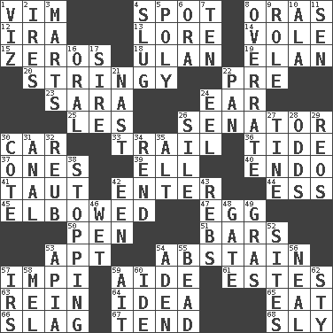 ACROSS 1. Zeal 4. Specific locale 8. Mouths or openings 12. Retirement account (abbr.) 13. Old wives' tales, e.g. 14. Grand slam 15. Nothings 18. ____ Bator, Mongolia 19. Enthusiasm 20. Slender, wiry 22. Before (prefix) 23. "Two Mules for Sister ____" 24. Ewer handle 25. French article 26. Elected representative 30. 4-wheeled motor vehicle 33. Lag or linger behind 36. Periodic rise and fall of the sea level 37. Singles 39. Pipe bend 40. Inside; within (prefix) 41. Pulled tight 42. Keyboard key 44. Curvy letter 45. Shoved, as through a crowd 47. Oval reproductive body of a fowl 50. Animal enclosure 51. Long, evenly shaped pieces 53. Fitting 54. Choose not to consume 57. Body of Kaffir warriors 59. Assistant 61. _____ Park, CO 63. It's straight from the horse's mouth 64. The main thing one is thinking about 65. Ingest 66. Volcanic refuse 67. Watch over 68. Playfully artful DOWN 1. That is 2. Angers 3. Shops 4. Strike heavily 5. Many (prefix) 6. Mouth or opening 7. Nine, plus one 8. Make much ado about nothing 9. Hero or heavy, e.g. 10. Wing 11. Elected rep. 16. Spoken 17. Beget 21. Political cartoonist Thomas 22. Baking dish 24. Snakelike fish 26. Filth; sediment 27. Prong on a fork 28. Probability 29. Vintage cars 30. ____ d'Azur (French Riviera) 31. Of or related to the anus 32. Reuben's nickname 34. Tear apart 35. The first octave above the treble staff 38. Obstructing or blocking passage 42. Car or cant ending 43. Confederate soldiers (slang) 46. Soggy 48. Yard entry 49. Pate de foie ____ 52. Settings 53. Capital of Western Samoa 54. Arabian gulf 55. Necklace unit 56. Anneal 57. Big collection agency 58. Cartoonist voice _ Blanc 59. Small island 60. Binary compound 62. Filthy place