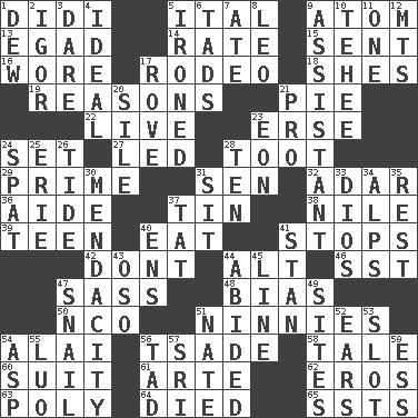 ACROSS 1. "You Light Up My Life" star Conn 5. Slanted text style (abbr.) 9. Smallest unit of an element 13. Mild oath 14. Assign a rank or rating to 15. Posted 16. Had on 17. Cowboy competition 18. "______ My Girl" (Turtles hit) 19. Thinks logically 21. Sliced dessert 22. Moving, as bait 23. Celtic language 24. Arrange properly for use 27. Directed 28. A blast of a horn 29. First class 31. Elected rep. 32. The sixth month of the Jewish calendar 36. Helper 37. Shallow baking pan 38. The longest river in the world 39. Adolescent 40. Erode 41. Constricts 42. Do not 44. Keyboard modifier key 46. Fast jet (abbr.) 47. Backtalk 48. Prejudice 50. Non-commissioned officer (abbr.) 51. Fools 54. Mountain range southwest of Kyrgyzstan 56. Sadhe (variant) 58. Falsehood 60. Set of matching outer garments 61. Johnson of "Laugh-In" 62. Greek god of love 63. More than one (prefix) 64. Passed on 65. Fast planes DOWN 1. Morning condensation 2. Russian composer Stravinsky 3. Have the gumption 4. Standard of perfection 5. Pressed 6. Small boys 7. Had dinner 8. Lion 9. Aide 10. Giggle 11. Single 12. Mountains (abbr.) 17. Be footloose 20. Filth; sediment 21. Adept person 23. A really long time 24. Argument over a trivial matter 25. 4th largest of the Great Lakes 26. Periodic rise and fall of the sea level 28. "___ Little Indians" 30. Ananias' fault 31. Be seated 33. "Vaya con ____" 34. High mountains 35. Respite 37. Make lace 40. Followers of ems 41. Comedian Laurel of Laurel & Hardy 43. Bear (Spanish) 44. Stayed 45. Actor's bit 47. Slow-paced one 49. Settings 51. Nathan's nickname 52. Hearing organs 53. Narrow, elongated depression 54. Viper 55. Nilotic language 56. Bit 57. Indian title of respect (Mr.) 59. Double-curved letter