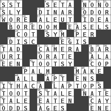 ACROSS 1. Fast jet (abbr.) 4. Bristle 8. Words to Nanette 12. Mischievous 13. Middle Eastern gold or silver currency 14. Aroma 15. Had on 17. Eskimo relative 18. The content of cognition 19. Mood resulting from idleness 21. Artist's stands 23. Small bed 24. Symbol (abbr.) 26. For each 27. Flat circle 28. The front part of a cuirass 30. Small boy 31. Device for capturing images 34. Long, evenly shaped piece 37. RI univ. 38. Declaim 39. Chicken ___ king 40. Car or cant ending 41. A girl or young woman (variant) 42. Police officer (slang) 43. Inside of hand 44. Cause to be 46. 100% 47. Fitting 50. Followers of ems 51. New York city 54. Portable computers 57. A blast of a horn 58. Showing deterioration from age 60. Nathan's nickname 62. Lie 63. Ingested 64. Island 65. Probability 66. Ripens 67. Compass dir. DOWN 1. Compass dir. 2. Messy guy 3. Polypeptide antibiotic 4. Grain storage towers 5. Foe 6. The 19th letter of the Greek alphabet 7. Johnson of "Laugh-In" 8. Annoying sounds 9. More peculiar 10. Christmas carol 11. Mouths or openings 13. Male parent 16. Greek god of love 20. And so on (abbr.) 22. Capital of Western Samoa 25. Confronts 27. Have the gumption 29. Jennifer or Joel 30. Third day of the wk. 31. Calm and collected 32. Scent 33. Floor protector 34. Keyboard key 35. _ vera 36. Reproach for some lapse or misdeed 41. Baby powder 43. Food holders 44. Was introduced to 45. Soon (poet.) 46. Hold, grip (Informal) 48. Food holder 49. Falsehoods 51. "Tell ____ the Marines!" 52. Frog relative 53. At sea 55. Fenced enclosure 56. Comedian Laurel of Laurel & Hardy 59. Label 61. Sight organ