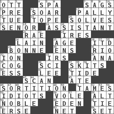 ACROSS 1. Baseball player Mel 4. Health resort 7. Settles 11. Before (prefix) 12. Fly high 13. Chummy 14. Third day of the wk. 15. Drink excessively 16. Finds the solution 17. Sir (Sp.) 19. Aide 21. Actress Charlotte 23. Angers 24. (Had) reclined 25. Grow older 26. It would 29. Maid-servant 30. Followers of ems 31. River (Sp.) 32. Electrically charged atom 33. Big collection agency 34. Santa ___, CA 35. Gear tooth 36. _-fi 37. Burlesque acts 40. Curvy letter 41. Area sheltered from the wind 42. Event that recurs at intervals 43. Skim 45. Had dinner 46. Drawing lots 51. Softens 55. Foolish or stupid persons 56. Grand slam 58. Keyboard modifier key 59. Having high moral qualities 60. Genesis locale 61. Make a knot 62. Celtic language 63. Remaining after all deductions 64. Put into a specified state DOWN 1. Elects 2. Loyal 3. Adolescent 4. "Barney Miller" actor Jack 5. Dad 6. Ancient Greek god of war 7. Table seasonings 8. Inventor's middle name 9. Small, secluded valley 10. System (abbr.) 12. Put through a sieve 13. Airs 16. Founders of families 18. NW Algerian seaport 20. Omens 22. Compass dir. 24. Yearns 25. Nest on high 26. Feeling or showing extreme anger 27. Canisters 28. ___ good deed 29. Expressions of contempt or scorn 32. Frozen water 33. Ancient Celtic tribe of eastern Britain 36. Narrow boards 37. R.R. building 38. Baby cat 39. The main thing one is thinking about 43. Took without asking 44. Quote 46. Trig term 47. Scent 48. Teases 49. Baking chamber 50. Connecting point 52. Floor protectors 53. Writer Wiesel 54. Proofreading order 57. Allow