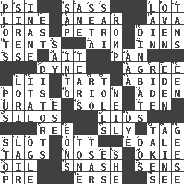 ACROSS 1. 23rd letter of the Greek alphabet 4. Backtalk 8. Car dealer's back yard 11. Actor's bit 13. Approach 15. Actress Gardner 16. Mouths or openings 17. Stone: prefix 18. South Vietnam president (1954) 19. Portable shelters 21. Direct toward a target or goal 22. Taverns 23. Compass dir. 24. Small island 27. Baking dish 29. Centimeter-gram-second unit of force 30. Match 34. Cards in a Roman deck? 36. Small pie 39. Tolerate 40. Cooking vessels 41. Constellation of myth 43. Arabian gulf 44. A salt of uric acid 46. Flatfish 47. "___ Little Indians" 48. Grain storage towers 49. Hats (slang) 51. Portuguese money of account (variant) 53. Mischievous 54. Label 57. Slit 60. Baseball player Mel 63. Peak District village in England 65. Labels 66. Olfactory organs 69. Migrant worker of the '30s 70. Petroleum 71. Box-office sellout 72. Elected reps. 73. Before (prefix) 74. Celtic language 75. Observe DOWN 1. Secret plans 2. Fathers 3. Empty; void 4. Plant excrement 5. A saturated hydrocarbon 6. Bristle 7. Indian skirt 8. (Had) reclined 9. Baking chamber 10. Scottish caps 12. Eastern Standard Time (abbr.) 14. Frolic 18. Empty-headed or silly people 20. Declare 25. To the inside or interior of 26. Lacerates 28. Auto club (abbr.) 29. What propaganda does 31. Travel on or in a vehicle 32. Paradise 33. Car or cant ending 34. Australian parrot (variant) 35. Slanted text style (abbr.) 37. River (Sp.) 38. For Whom the Bell _____ 40. Fluid product of inflammation 42. Famous astronaut Armstrong 45. Compass dir. 50. Color 52. Immeasurably long periods of time 54. Receives possession of 55. Place in a line 56. Honkers 57. Cease 58. Den 59. Stare 61. Heavy book 62. Russian ruler of old 64. Two (Sp.) 67. Curvy letter 68. A female animal or person