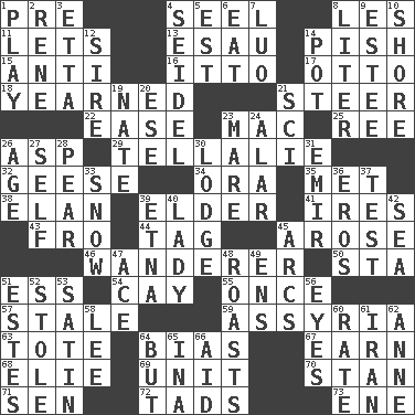 ACROSS 1. Before (prefix) 4. Sew up the eyelids of hawks and falcons 8. French article 11. Allows 13. He sold his birthright 14. Expression of disdain 15. Opposed to 16. "Tell ____ the Marines!" 17. "Beetle Bailey" pooch 18. Had a strong desire 21. Guide 22. Comfort 23. Big _ 25. To separate or throw off 26. Viper 29. Copy Pinocchio 32. Honkers 34. Mouth or opening 35. Was introduced to 38. Enthusiasm 39. A person who is older than you are 41. Angers 43. From 44. Label 45. Came up 46. Roamer 50. R.R. building 51. Curvy letter 54. Island 55. At one time in the past 57. Lacking originality or spontaneity 59. Nineveh was its capital 63. Carryall 64. Prejudice 67. Merit 68. Writer Wiesel 69. A single undivided whole 70. Comedian Laurel of Laurel & Hardy 71. Elected rep. 72. Small boys 73. Compass dir. DOWN 1. Romp 2. French philosopher Descartes 3. Singer James 4. Beer mug 5. Eastern Standard Time (abbr.) 6. Ingest 7. Nilotic language 8. 61 cubic inches 9. First name in cosmetics 10. Dinah or Pauly 12. Title for a man of rank and authority 14. Cooking vessel 19. Nathan's nickname 20. Compass dir. 21. _-fi 23. Female horse 24. Having or resembling wings 26. Mature 27. Itself 28. Lightbulb-shaped fruit 30. Cabin 31. Arab leader 33. Overwhelm 36. Greek god of love 37. Trial 39. Inactive volcano in Sicily 40. Kenny Rogers chart-topper in '80 42. Ocean 45. Arches 47. Adept person 48. Ridicules or criticizes harshly 49. Followers of ems 51. _____ Park, CO 52. Took without asking 53. Smooth fabric 56. Snake ____ (dice throw) 58. Area sheltered from the wind 60. Pace 61. SW Asia republic 62. Queen of England 1702-14 64. With the exception that 65. _ tizzy (2 wds.) 66. Assist