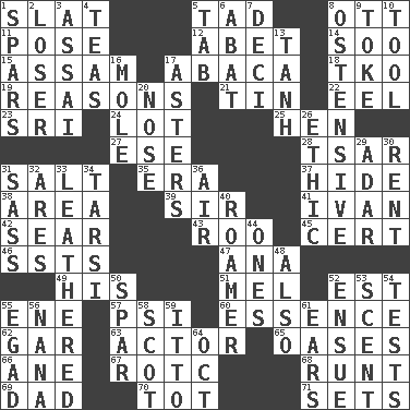 ACROSS 1. Narrow board 5. Small boy 8. Baseball player Mel 11. Introduce or present, as a question 12. Collude with 14. "Barney Miller" actor Jack 15. Indian state 17. Phillipine bananalike plant 18. Ring climax 19. Thinks logically 21. Shallow baking pan 22. Snakelike fish 23. _ Lanka 24. Car dealer's back yard 25. Layer 27. Compass dir. 28. Russian ruler of old 31. Table seasoning 35. Period 37. Flintstone garb 38. Length times width 39. Title for a knight 41. "Terrible" tsar 42. Burn superficially 43. Friend of Pooh 45. Sure thing 46. Fast planes 47. Santa ___, CA 49. Part of HMS, perhaps 51. Cartoonist voice _ Blanc 52. Eastern Standard Time (abbr.) 55. Compass dir. 57. 23rd letter of the Greek alphabet 60. Substance 62. Slender fish 63. Thespian 65. Fertile tracts in a desert 66. A saturated hydrocarbon 67. College mil. group 68. The smallest animal of a litter 69. Male parent 70. Small child 71. Arranges properly for use DOWN 1. Practice fights 2. Failure 3. Slender Brazilian palm 4. Afternoon social gatherings 5. Keyboard key 6. Blind as ____ 7. Tenth: prefix 8. Clearly or manifestly demonstrative 9. Puff or smoke 10. Instrument 13. Hyperbolic tangent 16. Undercover agent 17. Michaelmas daisies 20. Characteristic smell of wine 26. Value system 29. The sixth month of the Jewish calendar 30. Monthly bill 31. Backtalk 32. Ancient Greek god of war 33. Tough but pliablecoriaceous 34. Tarsus (plural) 36. Atmosphere 40. Wanderer 44. Singles 48. In addition 50. Practice fight 52. Follow as a consequence or result 53. Aroma 54. Trials 55. Mild oath 56. Grandmother 58. Highlander 59. "Tell ____ the Marines!" 61. Hearing organs 64. Sep. follower