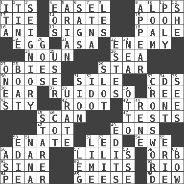 ACROSS 1. It is 4. Artist's stand 9. High mountains 13. Neckwear 14. Speak pompously 15. "Silly old bear" 16. Cuckoo 17. Signals 18. Diluted with white 19. Oval reproductive body of a fowl 21. White ___ sheet 22. Foe 24. Part of speech 26. Ocean 27. Off-Broadway awards 29. Play the lead 30. Trap for birds or small mammals 31. Drop; flow; fall 33. Music discs 36. Hearing organ 37. Boisterous (Brazilian Portuguese) 40. Portuguese money of account (variant) 41. Filthy place 42. Carrot, for example 43. Marketplace scale 45. Examine hastily 47. Trials 48. Small child 49. Immeasurably long periods of time 50. Maternal 52. Directed 54. She-sheep 56. The sixth month of the Jewish calendar 57. Ms. Damita and namesakes 59. Globe 61. Trig term 62. Gives off 63. River (Sp.) 64. Lightbulb-shaped fruit 65. Honkers 66. Morning condensation DOWN 1. Call ___ day 2. Prong on a fork 3. Signiory (variant) 4. Greek goddess of the dawn 5. Believer in; advocate of (suffix) 6. Droops 7. Inactive volcano in Sicily 8. French article 9. Become visible 10. Rich soil 11. More than one (prefix) 12. A female animal or person 20. Moves 22. _____ Park, CO 23. Teachers' org. 25. One who makes use of a thing 27. Singles 28. Water vessel 29. Narrow opening 31. The Jewish people; Israel 32. Wedding promise 33. What you're doing now 34. Gouge 35. Perceives with the eye 38. A salt of uric acid 39. "Beetle Bailey" pooch 44. French philosopher Descartes 45. A viewer who gazes fixedly 46. Small bed 49. Prepares for publication 50. Singer Brickell 51. Grandmother 52. Citrus frut 53. Writer Wiesel 55. 4th largest of the Great Lakes 56. Cleo's killer 57. Part of a journey 58. Compass dir. 60. Ribbon knot