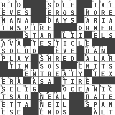 ACROSS 1. To free from 4. Not divided or shared with others 8. Make lace 11. Nights before holidays 13. Greek god of love 14. Greater amount 15. Nanny 16. 24-hour periods 17. Operatic vocal solo 18. Heighten or intensify 21. Abalone 22. Play the lead 23. Cards in a Roman deck? 25. Raised railways 26. Actress Gardner 29. A testis 32. Twentieth part of a lira 34. Night before a holiday 35. One of the 12 tribes of Israel 38. Shaw product 39. Fragment 41. Having or resembling wings 43. Shallow baking pan 44. Mayday 45. Gives off 46. Plea 50. John Ritter's dad 51. Period 54. White ___ sheet 55. Become fatigued 57. Major League Baseball Commissioner Bud 59. Pertaining to the sea 63. Russian ruler of old 64. Anneal 67. Pace 68. Singer James 69. Famous astronaut Armstrong 70. Connect, as a bridge 71. Compass dir. 72. Extremities 73. The first octave above the treble staff DOWN 1. Painter Guido (1575-1642) 2. _ the terrible 3. Lairs 4. Spring feasts 5. Mouth or opening 6. Myrna of the movies 7. Curvy letter 8. Singer Mel 9. Satellite of Uranus 10. Lacerates 12. Plant excrements 14. Impair 19. "Tell ____ the Marines!" 20. Actress Charlotte 21. Petroleum 23. Moving, as bait 24. On the rocks 26. Cleo's killer 27. Electrical Unit 28. Jai ____ 30. Laconic 31. Dutch treat 33. Centimeter-gram-second unit of force 36. Came down and settled, as after flight 37. Nathan's nickname 39. Fast planes 40. Israeli folk dance 42. Acura sports coupe 45. Jane of fiction 47. Tired old horse 48. Ringlike coral islands and reefs 49. Nervous spasm 51. First name in cosmetics 52. Musical pauses 53. Having winglike extensions 56. Hearing organs 58. Retirement account (abbr.) 60. California wine valley 61. Slanted text style (abbr.) 62. Penny 64. Compass dir. 65. Car or cant ending 66. Help