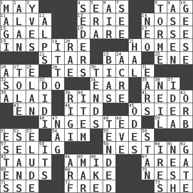 ACROSS 1. Fifth month 4. Oceans 8. Label 11. Inventor's middle name 13. 4th largest of the Great Lakes 14. Olfactory organ 15. Highlander 16. Have the gumption 17. Celtic language 18. Stimulate to action 21. Dwellings 22. Play the lead 23. Sound made by sheep 25. Compass dir. 26. Had dinner 29. One of the two male reproductive glands 32. Twentieth part of a lira 34. Ewer handle 35. Cuckoo 38. Jai _ 39. Remove soap 41. Make new 43. Conclusion 44. It would 45. Flexible twig of a willow tree 46. Swallowed 50. Experiment locale 51. Compass dir. 54. Direct toward a target or goal 55. Nights before holidays 57. Former Milwaukee Brewers owner Bud 59. Inhabiting a nest 63. Tense 64. Among 67. Length times width 68. Conclusions 69. Immoral or dissolute person 70. A home for chicks 71. Compass dir. 72. Flintstone 73. A female animal or person DOWN 1. Wise men 2. ____ Jay Lerner 3. Jacques Cousteau's middle name 4. Spring feasts 5. Period 6. Atmosphere 7. Perceive with the eye 8. Singer Mel 9. NE Netherlands city 10. Honkers 12. High mountains 14. Modern: prefix 19. "Tell ____ the Marines!" 20. Actress Charlotte 21. Actor Linden 23. Prejudice 24. 43,560 square feet 26. White ___ sheet 27. Lacquered or enameled metalware 28. Style 30. Watches over 31. Hearing organs 33. "You Light Up My Life" star Conn 36. Famous astronaut Armstrong 37. The main thing one is thinking about 39. Swiss mountan, "Queen of the Mountains" 40. Detail 42. Globe 45. Lyric poems 47. Tired old horse 48. Watched over 49. First lady 51. _____ Park, CO 52. Actors Connery and Penn 53. Evade 56. Comedian Laurel of Laurel & Hardy 58. It is 60. Angers 61. Tender 62. Yard entry 64. Sandy's bark 65. Spoil 66. D.D.E's nickname